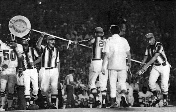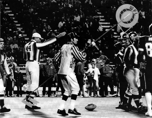 WFL Referee Barry Brown signals a First down after the Dickerod is used during the World Bowl.