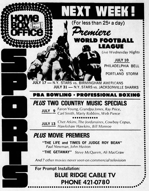 Home Box Office Sports ad announcing the premier of World Football League games for the 1974 season. NOTE: Special thanks to Max Segal and Bruce Clarke for their assistance on this page. |