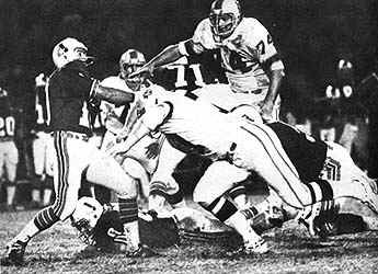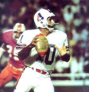 George Mira unloads a pass against an improved Hawaiian team HOF: Birmingham and Memphis were two of the strongest teams in the WFL and both had dual quarterbacks (Memphis with John Huarte and Danny White and the Americans with you and Matthew Reed) do you think this is why you were so successful? GM: Well, I think when I went down, we had three quarterbacks who could play, when I went down Matthew came in. Matthew had the talent and the physical abilities to do a lot of things that I couldn't do, and that helped the team. Of course, I would help him with the play calls and the defenses they were puttin' up front and then Denny Duron was there and he would put his voice in and point out some things. That made us a better quarterbacking unit because of the guys sticking together. HOF: Birmingham was a major league caliber city for the WFL. How did you feel when the reports started to surface about the reporting of false attendance numbers and players not being paid? GM: Disappointed. No doubt about it, all the players were let down. There was a lot of people coming to the ball games in Birmingham, and we were trying to put the best product out there and play our best, and when this stuff came out it was heart breaking. A lot of the guys were very disappointed, very upset, and very mad. You bust your butt to do what we did and then all of it is effected by what you hear is going on in other cities around the league. We won the World Bowl and I was the MVP, and me and Ross Brupbacher, were the only two guys who didn't get a championship ring. Everybody else got them and we didn't. When the WFL started up in '75, Pee Wee Burgess was one of the owners, and we didn't get one 'cause we went to different teams. In fact, Earl Knabb, owner of the Jacksonville Express, made a bet with Pee Wee and told him, "If we win the ball game at Jacksonville tonight, you buy George that ring. If we lose, I'll buy him the ring." I never pursued it. I figured that if they were gonna be that way about it, the hell with it. I would have loved to have gotten that damn thing, being MVP and all. I saw John Matlock's, it's a nice ring. HOF: William Putnam paid a lot of money to NFL players to jump to the Americans; Detroit Lion wide receiver Ron Jessie, Dallas Cowboy Jethro Pugh, Pittsburgh Steeler defensive lineman L.C. Greenwood and Oakland Raider quarterback Ken Stabler. At the end of the '74 season, Birmingham was suffering financial problems due to the huge cash bonuses paid to these players, many of the Americans went without pay, how did that make the team feel? GM: I thought that was wrong. We had the nucleus of a great team and a great league. We had some young stars and some veteran stars. Why didn't the WFL make its own superstars? Why go in the other direction? We had it going right. That was what really hurt us, they went out and spent a lot of money on future guys. The hell with that! Pay the guys that are already here, continue with what you got. Get it going for four or five years then pay the money for a player or two. Don't go dumpin' all that money, unless you have a well that won't run dry. Then it's a different ball game. It seemed to me that some of the guys they checked out as owners that well wasn't very deep. Maybe they expected to get a TV deal with those players, but if you're gonna have a league you need some power behind you. The Birmingham Americans would have ended up making a profit that first year. One day, Mr. Putnam asked me what I thought, and I told him, "Well, I think you should put a cap on salaries. You can't go out spending a lot of money on players unless you have a tremendous amount of money. Let's wait five or six years, maybe then you'll be satisfied with the product you have." They signed Kenny, who was from Alabama, and gave him a lot of money, and you can't blame Kenny for takin' it. I never saw him at a game, maybe he was up in the press box. HOF: Did you, as a veteran, ever have to stand up and address the team during the difficult times? GM: I did, but there were a lot of guys who did. There were times when we had discussions, while all the money problems were happening in Birmingham, on whether we wanted to play or fold. The guys all voted, unanimously, that we were going to continue even if we had to play for free. Even with no pay. Some guys didn't get paid the last few weeks of the season. We said, "We're gonna finish this." And we did, in style, that's class baby. HOF: Who were some of the leaders on the Americans? GM: I was. Charley Harraway. Paul Robinson would get up and say a few things. Larry Estes on the defense would talk about the way things were going. HOF: How would you describe your quarterbacking style? GM: Like a Fran Tarkenton. I was a mover. I'd throw from the pocket, out of the pocket. I used to do anything to win a ball game. I didn't like sitting back in the pocket, I wasn't a one dimension guy. Whatever it took, I did it. I was fortunate enough to play in the NFL. I had some good coaching. I had Y.A. Tittle as a coach in San Francisco, and I was with the Colts with Johnny Unitas, and worked under Don Shula in Miami, I learned to call plays, audible, and learned to get the blockers in good situations. HOF: In the playoffs, the Americans defeated Hawaii 22-19. Did the Hawaiians give you a scare? GM: Yeah, they did. You know, all the WFL teams were gettin' better towards the end of the season, gettin' stronger. Hawaii was one of those teams. They brought in a couple of players (quarterback Randy Johnson, wide receiver John Isenbarger and defensive back Willie Williams) and had a couple of players mature and they were a good ball team. HOF: Did it surprise you that Florida beat Memphis 17-3? GM: Yeah. We all thought, the players, that it would be us and Memphis in the World Bowl. When the Blazers knocked them off we couldn't believe it. We were all talking about the game. HOF: Do you think the WFL wanted a Birmingham-Memphis World Bowl? GM: No. I t