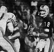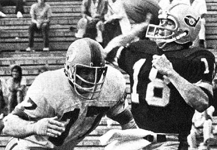 Bubba Wyche throws as Hawaii's Ron East charges in HOF: Detroit players were constantly asked to make sacrifices to remain in the league and to keep playing football. Did that ever get tiresome? BW: I think that was the beginning of the end. We got very disappointed and disgusted about the sacrifices we were asked to make. In the beginning of the season, we overlooked the shortcomings of the league and addressed it as an opportunity to pursue a career a lot of the players would not have the opportunity to pursue. Many of the guys from the NFL or CFL were qualified and were looking for a chance to perhaps put them back in those leagues. The sacrifices we were asked to make became too overwhelming. The players on the Wheels were not getting paid at all. We didn't even get food money. So it was devastating to some one who had high aspirations of getting into pro football and then couldn't get food money or compensation for your work. HOF: When did it first hit you that the Wheels were in financial trouble? BW: There were little signs. A secretary would disappear, and then her typewriter would disappear. Then you'd call the office and the phone would ring for an unlimited amount of time. That gave you the indication of poor management or lack of funding. Then our paychecks were delayed with petty excuses, almost unbelievable excuses. Things like; "administrative problems", "hold ups at the main office", "the WFL has requested that we hold back because the league is going with a unified distribution of funds to the players". We would stand there and say, "Home office? I thought this was the home office?" Or "Unified funds? The league doesn't have any money!" Eventually the delays became weeks, and weeks became months, and the whole thing started to fall apart. The team, the players, would get together and we'd talk. I was the captain of the Wheels, along with two other players, and we would go to management and discuss the troubles. There were no personnel left. Management would fire the trainer, the laundry attendants, and we couldn't get towels or tape. Even though those salaries were cut there wasn't any money to give to the players. I lived on Ford Lake and defensive tackle Mike Taylor moved in. Then one of the defensive coaches, Owen Dejanovich, and his wife moved in and we eventually had a commune setting. It included players as well as coaches; I know they were not getting paid as well. In some ways the coaches had it harder because they needed to maintain a positive attitude for the players despite what was happening to them. We would share expenses, meals, everything. Owen Dejanovich and I became close friends. He was a defensive coach with the British Columbia Lions of the CFL and I knew him from my playing days, and he let me know that times were very tough financially. Eventually it hit all of us, and it was obvious what was going to happen. Even with all this going on, it generated more friendships and brought the team closer. Players had to move in with each other, share meals and food, split bills, and it was a tough time for a group of people who had aspirations of this being the best of times. HOF: There were rumors that John DeLorean was trying to buy the Detroit Wheels, do you remember that time? BW: Yes. I suspect that a lot of rumors were generated by the team to create a positive atmosphere for the league and the players. At that time, John DeLorean didn't become a wealthy man by going into ignorant business ventures. Even though his name was mentioned, I don't think he was "any man's fool", he saw that this was an up-hill battle and that he would be throwing away good money after bad. HOF: There were also rumors that the Wheels would relocate to Louisville, Kentucky or Charlotte, North Carolina. Where the players hoping for relocation? BW: The players were interested in anything that would create a positive return. I think that this was another example of management trying to stimulate to hang on a little longer. It all became false hope. A new city, new owners, new money coming in- blah, blah, blah. There was hot air and propaganda to keep the enthusiasm as long as it could. There really wasn't anything more clear than the lack of attendance, the lack of media attention, lack of enthusiasm- all of it was showing the demise of the team. HOF: With all the financial problems going on, in late September you were charged with assault by Albert Chester, the Wheels accountant. Was that meeting an example of how you went to management on behalf of the players? BW: I was one of the captains of the Detroit Wheels. Myself and two other co-captains were in a meeting with Albert Chester to see what the status of compensation was for the players- we hadn't been paid in weeks. Players were having medical problems and couldn't receive treatment, some couldn't eat, others didn't have a home or a place to stay, many of the players were missing practice 'cause they didn't have the money to pay for gas or even a bus ticket- and on down the line, just horrible, horrible stories. Albert Chester was the comptroller, the accountant, the CPA for the Wheels. I honestly felt that he was put in that position as a scapegoat. Being put in that position as a scapegoat, knowing that he had no where to turn, and he had no options. There were no funds and that made it difficult for him to negotiate. Here we sat, three football players, big 6-foot-5 co-captains all around the accountant. I think the atmosphere of intimidation that he was feeling was very clear. As it turned out, it became a heated discussion where falsehoods were being stated and myself and the other co-captains were just saying, "Look, that's not accurate, that's not what's taking place. You've got people here who can't even eat three meals a day." We said to him, "Stop telling what's going to happen, and let us see something happen." Eventually, it got to the point where he was so intimidated he was sitting there shaking........just s