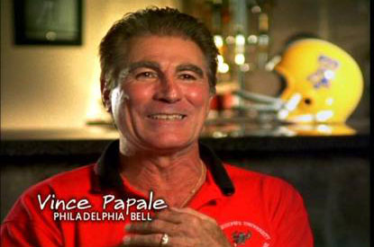 Vince Papale interview on the Lost Treasures of NFL Films: The World Football League, Show #15. WFL: Tell us how the movie "Invincible" came about and how you felt about Disney leaving your playing days in the WFL out of the storyline? VP: Well, I really wanted that to be in there first of all you know...I argued for them to get the WFL in there, but they left a lot of things out. The original script had my father left out, and I had to lobby for him to get in there, so that was one thing. Then I wanted to get my high school in there. I wanted to get St. Joe's in there. Disney has a way of doing things and not a criticism of Disney because the movie turned out to be successful, but what they wanted to do was to take a chapter of that life and of my life at that particular time when the World Football League had folded and I was coming off of the folding and I was actually waiting to go back and get my teaching job back, so I was a substitute school teacher and a bartender...part time bartender, but in reality I was a full time teacher working on his Masters and their thinking according to the screen writers simply was they felt the dramatic effect of making the Philadelphia Eagles might have been diluted if they had put the WFL in there which I didn't feel that way, but they know how to tell stories, and I was fine with that and I had to sign off on it obviously and that's how it came about. You know the way the movie happened is real simple. Everybody thinks I write a book then they made a movie about that. Actually Rocky turned 25...2002...the fictional character I was always known as the real life Rocky when I tried out for the Eagles and I made the Eagles you know...a thirty year older and NFL Films decided to run with that and they did a feature that was shown on ESPN and then Hollywood saw it and one thing led to another and it became a movie, so it's four and a half years out now. WFL: You're here in Philadelphia for the Bell WFL team reunion. How does it feel to be here tonight with your teammates from thirty-five years ago and what does that time in your life mean to you? VP: Well it means a lot to me. If it weren't for the WFL then there wouldn't have been a NFL, and I'm not using that as a stepping stone or saying that it was a stepping stone. To me it's something I'm very proud of. I'm very proud of the fact that there were 850 guys at that original tryout...me and Dennis Lozzi were the only two that got to training camp and actually made the team. Then poor Dennis got his knee blown out in Birmingham. I'll never forget that game in Birmingham...that big brawl that we had down there and Lozzi got his knee blowed out... and hey you know it's going to be so good to see guys that I loved back then and Ron Holliday who had such a tremendous impact on me. He took me under his wing...he was my mentor. Coach Waller giving me that opportunity... as crazy and nutty... and as tough as he was...I see him all the time and that's another thing I wish that in the movie that Ron Waller would have been given the just due that he should have gotten for giving me that first opportunity to play pro football. Once again they just didn't want to bring a whole bunch of people into it, so I'm really looking forward to it. Actually I'm real nervous you know...nervous in the nicest way...um how I'm going to be accepted because I'm the one obviously that went on and got the marquee out of it. That's why I really didn't want to say a whole bunch when I got there because Richie (Pollak) had asked me if I would get up and say a few words. I just want to be one of the guys and be recognized as someone who played for the Bell and not the Philadelphia Eagles and something I'm really proud of. I can't wait to see the guys. WFL: Summarize your playing days in the World Football League. VP: Awesome... Spectacular... Did the unthinkable... Incredible...Amazing... Fun... Funny... Heartbreaking...Just one of the greatest experiences of my life... Something I'm very proud of ...as I said...memories I will have forever and memories I'll cherish forever.