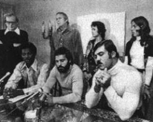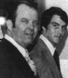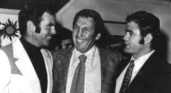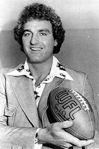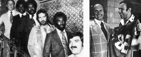 Commissioner Chris Hemmeter and his parade of WFL stars for the 1975 season. (L to R) Hemmeter, Paul Warfield, Calvin Hill, Jim Kiick, John Gilliam, and Larry Csonka. Bell owner John Bosacco welcomes Ted Kwalick after his contract with the Hawaiians was transferred to Philadelphia for 1975.