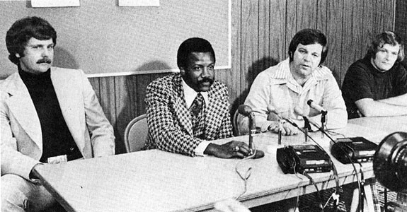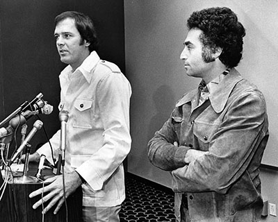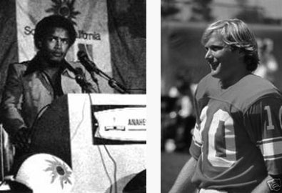 Anthony Davis at a Sun press conference after signing contract. Pat Haden in a Sun uniform after signing with WFL instead of the NFL Rams.