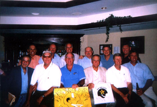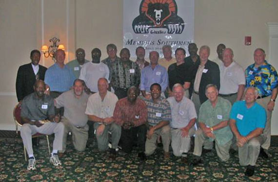 (Standing L to R) FB Carl Bartles, DB Larry Willingham, Assistant Coach Wayne Grubb, DT Bob Taterak, QB George Mira, LB Warren Capone, OL Gary Gennerich, LB Jim Teal. (Sitting) WFL President, General Counsel Don Regan, Event Organizer Greg Allred. Not shown: QB Matthew Reed, WR Dennis Homan, DB Cecil Leonard, Trainer Drew Ferguson, Radio Play-by-Play Larry Matson, and Widow of owner A.E. "Pee Wee" Burgess Mary Ruth Burgess. Photos from the Americans/Vulcans WFL Reunion 1974-1975 Memphis Southmen Reunion: August 6-8, 2004