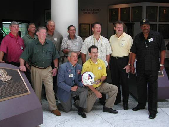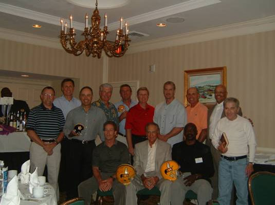 L to R (standing) Tom Sherman, Kreg Kapitan, Jere Brown, Dana Carpenter, Tom Chandler, Darrel Bunge. (Sitting) Herb Gluck, Greg Lens, John Elliott, Head Coach Babe Parilli, Robby Reynolds, and Art Reynolds (Missing; Coach Lamar Leachman and Larry Butler) Photos from the Stars/Hornets WFL Reunion 1974-1975 Birmingham Americans/Vulcans Reunion: July 9-10, 2004