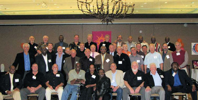 Front Row (Sitting - L to R): Kermit Johnson, Clay Jeffries, Terry Lindsey, James Baker, Greg Moses, Keith Denson, Mike Ernst, Coach Dick Enright, Curley Morrison ('74 GM), Booker Brown. 2nd Row L to R: Ed Kezirian, Robert Ferrell, Kevin O'Grady, Coach Tom Baldwin, Bill Kramer, Alonzo Emery, Tony Adams, Jack Conners, Eric Johnson, Ted Seifert, Greg Marderian. 3rd Row L to R: Chuck Bradley, Joe Carollo, John Hoffman, Mike Ryan, Younger Klippert, Eric Patton, Dave Williams, Neal Skarin, Mike Biscotti. 4th Row L to R: Rick Kukulica, Art Kuehn, Ike Harris, Tim Guy, Mike Ballew, Ken Lee, Gary Valbuena, Charles DeJurnett, Cephus Weatherspoon, James McAlister, Ed Weatherspoon. (Missing Rudy Holmes). Photos from the Southern California Sun Reunion 1974-1975 Southern California Sun Reunion: February 8-10, 2013