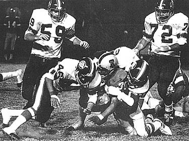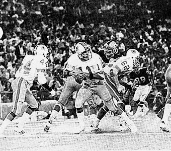 QB Tony Adams was pressured by the tough Hawaii defense anahiem, ca.; Randy Johnson, an eight-year NFL veteran who was cut by the New York Giants in September, got the Hawaiians on the right track toward the World Bowl. The Hawaiians defeated the favored Southern California Sun 32-14 before only 11,430 fans. Johnson completed 14 of 24 passes for 148 yards and two touchdowns and the Hawaiian defense dominated the Sun throughout the game. The Sun players who had decided to play the game only a few days before, threatened to strike over a missed payday. The Suns' two top draft picks, running back Kermit Johnson and offensive linemen Booker Brown refused to play in the game and were released. Their agent, Mike Trope, claimed that they, along with running back James McAllister were now free agents and could sign with any NFL team- the missed payday had violated a clause in their contract. On the field, Hawaii quarterback Randy Johnson passed five yards to John Kelsey in the second period and eight yards to John Isenbarger in the final period for touchdowns, while running back Al Davis had touchdown runs of three and two yards for the Hawaiians. A free-for-all erupted after Johnson's TD pass to Isenbarger and Sun defensive back Jim Bowman, who appeared to have started it by hammering Isenbarger, was ejected. Tony Adam's, the Sun's quarterback and the WFL's No.1 passer during the 20-game regular season, left the contest in the fourth quarter with an ankle injury. Gary Valbuena was intercepted three times and sacked three times by the Hawaiian defense. (Pictured above, Tony Adams passes against the Hawaii defense). HAWAII 7 10 8 7 -- 32 SOUTHERN CALIFORNIA 0 11 3 0 -- 14 Hawaii- Davis 3-yard run (run failed) 7-0 Hawaii- Coppedge 23-yard field goal 10-0 Hawaii- Kelsey 5-yard pass from Johnson (pass failed) 17-0 So Cal- Garcia 37-yard field goal 3-17 So Cal- Denson 46-yard pass from Adams (Jefferies, pass from Adams) 11-17 So Cal- Garcia 42-yard field goal 14-17 Hawaii- Davis 2-yard run (Weese run) 25-14 Hawaii- Isenbarger 8-yard pass from Johnson (pass failed) 32-14 RUSHING Hawaii- Davis 12-49, Heath 5-25, Clements 7-25, O'Leary 8-14, Johnson 1-6, Weese 1-(-2) Southern California- Herd 10-52, Nelson 14-39, Jeffries 4-9, Adams 1-3, Valbuena 1- (-4) PASSING Hawaii- Johnson 14-24-148-2TD Southern California- Adams 11-21-189-1TD (one intercepted), Valbuena 10-17-172 (three intercepted) RECEIVING Hawaii- Kelsey 6-82 (one touchdown), Delaney 5-40, Isenbarger 2-14, Davis 1-12 Southern California- Lindsey 4-59, Jeffries 3-26, Herd 2-34, Nelson 2-29, Williams 2-18, Harris 1-49, Parks 1-24, Denson 1-22 NOTE: This page was researched and written by Jim Cusano. This page appeared on the former World Football League Hall of Fame Website and is used with permission. |
