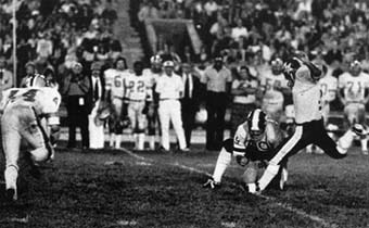 New York Stars 17, Philadelphia Bell 15. philadelphia, pa.; Moses Lajterman (pictured above), a 21-year old Argentine kicker, who had been cut by both New York and Philadelphia, kicked a fourth quarter, 40-yard field goal that gave the New York Stars a 17-15 victory over the Philadelphia Bell. Lajterman rejoined the Stars after starting kicker Pete Rajecki bruised his ribs against Birmingham in week 2. In the fourth quarter, the Bell had two chances to win the game, but Philadelphia kickers Jack Simcsak and George Chatlos both missed potential game-winning field goals late in the game. Chatlos' kick sailed wide right with only a few seconds remaining. New York defensive end Larry Estes was forced to play offensive center during the second-half after starter Bob Kuziel suffered an injury. A WFL record crowd of 64,719 fans attended the nationally televised game at JFK Stadium. New York Stars: Passing- Passing- T. Sherman 7-15-121-0t-1i; Rushing- B. Gladieux 21-74-1t, E. White 18-70, T. Sherman 8-27, B. Hermanni 1-25, D. Richards 10-5-1t; Receiving- A. Young 4-74, D. Richards 1-40, G. Sauer 1-5, E. White 1-2. Philadelphia Bell: Passing- J. Corcoran 14-24-215-2t-2i; Rushing- J. Land 14-59, C. Watts 5-19-1t, D. Shanklin 1-5, A. Thompson 1-3; Receiving- D. Shanklin 3-87, L. Cole 3-55, C. Watts 3-31-1t, A. Thompson 3-21, L. Hill 2-21-1t.