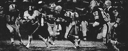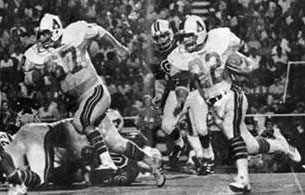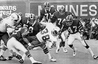 Birmingham Americans 58, Memphis Southmen 33. birmingham, al.; George Mira, and rookie quarterback Matthew Reed, shocked Memphis with five scoring passes to lead the undefeated Birmingham Americans to a 58-33 win over the Southmen. 61,319 fans packed Legion Field as one fan carried a banner that read "NFL Strikes. Legion Field sold out!!" Americans quarterback George Mira threw two strikes to Alfred Jenkins, for 38 and 74 yards, and a touchdown to Dennis Homan for 12 yards as the Americans built a 28-11 lead en route to the win. (Pictured above, running back Art Cantrelle follows Joe O'Donnell against the Southmen). Birmingham Americans: Passing- G. Mira 11-17-251-3t-1i, M. Reed 7-12-127-2t-0i; Rushing- P. Robinson 18-93-1t, J. Edwards 6-45-1t, C. Bartles 15-25-1t, C. Harraway 3-7, A. Cantrelle 3-0; Receiving- D. Homan 6-59-1t, A. Jenkins 5-200-3t, J. Bishop 5-95-1t, P. Robinson 1-13, A. Cantrelle 1-11. Memphis Southmen: Passing- J. Huarte 18-37-224-1t-4i, D. White 4-5-62-0t-0i; Rushing- J. Harvey 16-126-2t, J. Jennings 4-2-1t, P. Miles 2-3, J. Huarte 1-3; Receiving- E. Marshall 6-114, R. Wallace 5-61, G. Shirk 4-72-1t, J. Harvey 3-15, J. Jennings 2-2, J. Ettinger 1-13, P. Miles 1-9.