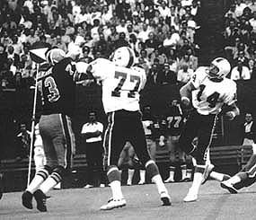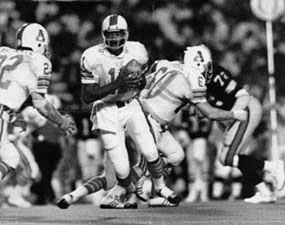 Houston Texans 15, Portland Storm 15. portland, ore.; The Houston Texans and the Portland Storm battled to a 15-15 tie (the WFL's first and only) before 15,686 fans at Portland's Civic Stadium. Portland took a 8-0 lead on Marv Kendrick's 6-yard run, but Houston came back scoring on Jim Nance's one yard plunge to tie the game at 8-8. Then Houston quarterback Mike Taliaferro hit wide receiver Rick Eber on a 12 yard pass to put the Texans ahead 15-8. The Storm marched back and tied the game when quarterback Ken Johnson (pictured above) threw a 15-yard touchdown pass to Sam Dickerson to tie the game. Portland Storm; Passing � K. Johnson 5-15-54-1t-1i, Barton 1-4-4-0; Rushing � Kendricks 22-81- 1t, K. Johnson 11-56, Ferguson 17-53, Mitchell 3-12, Turner 1-4; Receiving � Ferguson 3-21, Dickerson 1-15-1t, Kendricks 1-11, Hoss 1-11. Houston Texans; Passing � Taliaferro 11-22-138-1t-2i; Rushing � Nance 24-83-1t, Richardson 18-54, Odom 1-6, Gipson 2-4, Taliaferro 1-1, Eber 1-0; Receiving � Eber 3-34-1t, C. Frazier 2-40, Richardson 2-35, W. Frazier 2-16, Nance 1-7, Odom 1-6.