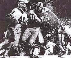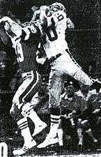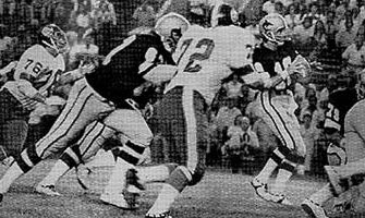 Southern California Sun 18, Houston Texans 7. houston, tx.; Flemming Jensen's 19-yard field goal and Durwood Keeton's interception return for a touchdown in the closing minutes helped the Southern California Sun defeat the Houston Texans 18-7, in a battle for first place in the WFL's Western Division. With the score tied at 7-7, Jim Bowman intercepted a Don Trull pass and returned it to the Texan 38. After a 20-yard run by Sun James McAllister, Jensen kicked the tie-breaking field goal with 2:09 remaining. The Texans got within field goal range before Keeton intercepted Trull and ran 68 yards down the sidelines for the final score with: 24 remaining on the clock. The game was the nationally televised WFL Game of the Week on the TVS Sports Network on August 15, 1974. (Pictured above, John Odom hauls in a pass from Don Trull as Jack Conners defends.) Houston Texans; Passing � Taliaferro 6-8-117-1t, Trull 8-14-69-0-2i, McVea 0-1-0; Rushing � Richardson 17-57, Nance 17-53, Robinson 14-35, Eber 1-3; Receiving � Eber 6-87, Odom 3-61-1t, Richardson 3-16, W. Frazier 2-23. Southern California Sun; Passing � Adams 4-13-48-0-1i, Valbuena 4-11-103-0-1i; Rushing � McAlister 7-50, Nelson 10-38, K. Johnson 10-28, Adams 3-7, Herd 2-5; Receiving � Williams 2-59, Harris 2-46, K. Johnson 1-20, Moses 1-17, Lindsey 1-7, Nelson 1-2.