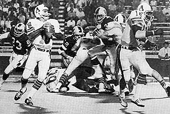 Birmingham Americans 39, The Hawaiians 0. birmingham, al.; Willie Smith dashed 81-yards on a punt return and Alfred Jenkins teamed with George Mira on a WFL record 95-yard scoring pass to lead the Americans to a 39-0 rout over Hawaii. The Americans scored 24 points in the second quarter and remained the only undefeated team in the WFL with a perfect 6-0 won-lost record. A crowd of 43,297 filled Legion Field- management claimed no free tickets were given away. (pictured above, George Mira fires downfield against Hawaii). Birmingham Americans; Passing � Mira 3-9-137�2t, Reed 3-9-85-0, Duron 0-2-0-0-1i; Rushing � Edwards 8-130-1t, Cantrelle 10-58-1t, Robinson 9-28, Harraway 8-25, Stark 1-11, Jenkins 1-3, Duron 2/-2; Receiving � Homan 3-47-1t, Jenkins 2-156-1t, Bishop 1-19. Hawaiians; Passing � Weese 17-35-188-0-2i, Fassel 5-12-68-0-2i; Rushing � O�Leary 19-100, Weese 4-19, Copeland 1-13, Taggares 1-9, Buchanan 1-6, Hutt 1-0; Receiving � Delaney 8-99, O�Leary 5-55, Hutt 5-51, Richardson 1-26, Kelsey 1-15, Taggares 1-11, Copeland 1-1.