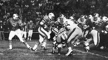 Florida Blazers 33, Jacksonville Sharks 26. orlando, fla.; A Tangerine Bowl crowd of 22,890 watched as state rivals Florida and Jacksonville fought a close game which ended in a 33-26 Blazer win. Florida running back Jim Strong scored on a goal-line plunge to lead the Blazers to the win. Despite being down 23-11 at half time, the Sharks fought back. Quarterback Reggie Oliver, a rookie, ran 12-yards for a touchdown and then hit Tom Whittier with a 7-yard scoring pass. The Blazers sealed the game when Blazer linebacker Louis Ross sacked Oliver for a late safety. As time expired, Oliver drove the Sharks deep into Florida territory, but a completion brought the Sharks only to the Florida 20 yard line. (Pictured above, Kay Stephenson looks downfield against the Blazer defense). Florida Blazers; Passing- Davis 11-15-132-0-2i, Reamon 1-1-51-1t; Rushing � James 16-89, Whitfield 8-32, Reamon 6-22, Davis 3-16-1t, Gatti 3-15, Strong 7-12-2t; Receiving � Maslowski 4-108-1t, Strong 4-41, Whitfield 1-19, Latta 1-15, Trapp 1-7, Reamon 1-7. Jacksonville Sharks; Passing � Oliver 4-11-55-1t-1i, Stephenson 2-8-19-0-2i, Stofa 2-5-24-0-0; Rushing � Durrance 17-53, Lake 6-32, Oliver 6-32-1t, Davis 3-16, Stofa 1-4, Thornton 1/-4; Receiving � Whittier 3-52-1t, Buie 1-13, Krepfle 1-11, Durrance 1-11, Hughes 1-8, Lake 1-3.
