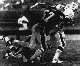 Houston Texans 14, New York Stars 11. new york, ny.; Instead of the calm repetition of last week's 43-10 rout of the Texans the Stars ran into a bizarre and emotionally charged situation and suffered a 14-11 loss to Houston. A crowd of 10,126 watched as a process server delivered a restraining order to Texan linebacker John Matuszak, who had earlier jumped to the Texans from the Oilers of the NFL. Matuszak took part in only a half dozen plays. The Texans also benefited from the presence of ex-New York Giant defensive back Richmond Flowers, who played a great game in the secondary. Texan quarterback Mike Taliaferro threw two touchdowns, a 6-yarder to Willie Frazier and a 25-yarder to wide receiver Rick Eber. New York quarterback Tom Sherman completed 12 of 29 passes for 119 yards and a touchdown in a losing cause. (Pictured above, John Matuszak sits on the bench after being served a restraining order from sheriff's deputies). Houston Texans; Passing � Taliaferro 11-20-182-2t-1i, Nobles 1-3-5-0; Rushing � Richardson 18-83, Nance 8-27, Nobles 3-11, Blackney 3-9, McVea 6-7, Gipson 2-3; Receiving � Eber 4-81-1t, Odom 3-64, W. Frazier 2-19-1t, Richardson 2-18, Nance 1-5. New York Stars; Passing � Sherman 12-29-119-1t; Rushing � E. White 9-42, Gladieux 12-26, Sherman 4-23, Richards 2/-5; Receiving � Kapitan 5-54-1t, Spinks 5-50, Gladieux 1-11, Young 1-4.
