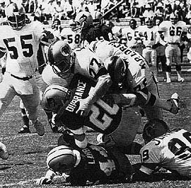 Philadelphia Bell 27, Detroit Wheels 23. philadelphia, pa.; The Philadelphia Bell defeated the Detroit Wheels, losers of eight in a row, 27-23 before 15,100 fans at JFK Stadium in Philadelphia. Claude Watts ran for two first quarter touchdowns and Jerry Warren kicked a pair of field goals to lead Philadelphia. The Bell opened the game scoring when quarterback Jim "King" Corcoran hit Watts on a 17-yard touchdown pass. In the third quarter, with Detroit leading 16-14, Bell kicker Jerry Warren split the uprights from 23-yards out to give Philadelphia the lead 17-16. Corcoran then hit Donnie Shanklin with a 24-yard touchdown pass as Philadelphia took a commanding 24-16 lead, and the win. (Pictured above, Claude Watts run with the Wheels' Mike Kuehn in pursuit) Philadelphia Bell; Passing � Corcoran 11-29-184-2t; Rushing � Land 16-90, Watts 15-34-1t, Shanklin 2-27, Thompson 2-24, Corcoran 1/-1; Receiving � Shanklin 3-64-1t, Land 3-32, Watts 2-35-1t, Carter 1-23, Dunn 1-22, Thompson 1-8. Detroit Wheels; Passing- Wyche 13-28-156-0-2i, Shaw 0-1-0; Rushing � Mims 15-85-1t Scarber 16-49, Wyche 6-30-2t, Sadler 2-24, Rathje 2-6; Receiving � Scarber 4-33, Mims 4-20, Phillips 3-29, Sadler 1-68, Henderson 1-6.