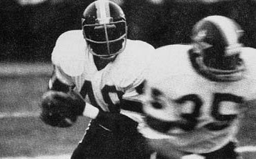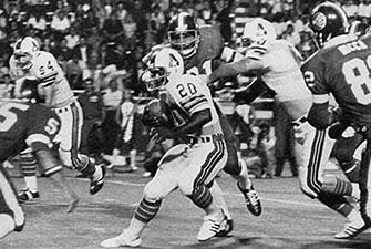 New York Stars 24, Philadelphia Bell 16. new york, ny.; Undismayed by the smallest crowd to see a WFL contest, the New York Stars defeated the Philadelphia Bell 24-16. Only 6,132 fans (5,237 paying) attended the game at Downing Stadium on a Monday night. Bell quarterback "King" Corcoran threw five interceptions and was replaced by Frank DiMaggio. DiMaggio launched a potential 65-yard touchdown pass to Ron Holliday but overthrew him, ending a Bell drive that almost tied the game. Stars running back Bob Galdieux ran for 161 yards on 18 carries and quarterback Tom Sherman was 12 of 24 for 141 yards and two touchdowns. (pictured above, Dave Richards runs against the Bell with Bob Gladieux leading the charge). Philadelphia Bell; Passing � Corcoran 18-30-204-1t, 5i, DiMaggio 1-3-16; Rushing � Thompson 12-53, Land 8-31, Watts 5-19, Shanklin 1-3, Joe 2-0-1t, Holiday 1/-4; Receiving � Land 7-81, Holiday 5-51, Dunn3-50, Thompson 2-24, Shanklin 1-8, Watts 1-6-1t New York Stars; Passing- Sherman 12-24-141-2t; Rushing � Gladieux 28-161, E.White 9-21, Sherman 7-21-1t, Richards 1-11; Receiving � Kapitan 6-80, Parson 3-25-1t, E.White 2-8, Askson 1-28-1t