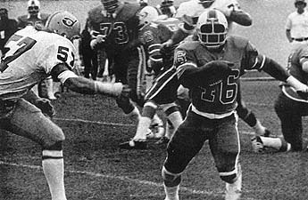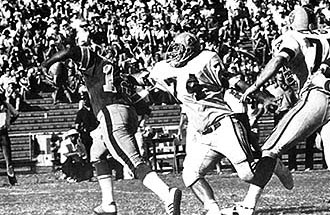 Hawaiians 33, Houston Texans 15. honolulu, hw.; Hawaii running back Ernie O'Leary rushed for 107 yards and a touchdown and Hawaii erupted for 23 points in the fourth quarter to defeat the Houston Texans 33-15. In the third quarter, wide receiver Grady Richardson hauled in a 33-yard touchdown pass from Norris Weese to break a 7-3 Houston lead. Weese then hit O'Leary for the action point and a 11-7 Hawaii lead. 10,248 fans in Honolulu Stadium rose to their feet as cornerback John Moseley intercepted a Mike Taliaferro pass and returned it 52 yards for a touchdown to clinch the win. Hawaii went on to add 18 more points before Houston could recover. The Hawaiians originally had their entire home games scheduled on Sunday�s. This game was played on September 1 and was the final Sunday home game for 1974. (Pictured above, Levi Stanley wrestles down Houston quarterback Mike Taliaferro). Hawaiians; Passing � Weese 7-13-160-1t, Hargett 5-14-47; Rushing � O�Leary 23-107-1t, Turner 2-63-1t, Weese 4-30, Davis 4-5, Heath 3/-1; Receiving � Delaney 3-35, O�Leary 2-43, G. Richardson 2-41-1t, Davis 2-40, Kelsey 1-27, Hutt 1-12, Weese 1-9 Houston Texans; Passing � Mays 17-32-142-0t-1i; Rushing � M. Richardson 9-39-1t, McVea 13-30, Mays 3-25-1t, Blackney 5-15, Nance 2-0; Receiving � Eber 12-107, D. Davis 2-24, Odom 2-18, McVea 1-3