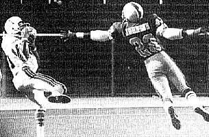 Memphis Southmen 28, Charlotte Hornets 22. memphis, tn.; Flanker Ed Marshall caught two touchdown passes as the Memphis Southmen ended the regular season with a 28-22 win over the Charlotte Hornets before 13,339 fans. Back-up quarterback Danny White completed a seven-yard pass to Marshall in the third quarter and a 27-yarder in the final period. Hornet running back Don Highsmith scored two touchdowns and ran for 124 yards on 22 carries. The loss, the fourth in a row for the Hornets, dropped Charlotte to 10-10. Hornet owner Upton Bell was uncertain about the teams' future and standing in the playoffs, and decided to look for investors for the team instead of taking part in the WFL playoffs. Memphis, ended the WFL season with the best record, 17-3, and would await the winner of the Florida-Philadelphia match up. (Pictured above, Ed Marshall catches a touchdown pass over Hornet Ike Thomas). Fire Forfeits Game to Philadelphia Team owner Origer calls game "meaningless" philadelphia, pa.; The World Football League announced that the Philadelphia Bell had been awarded a win by forfeit over the Chicago Fire. Fire owner Tom Origer announced that his club would not travel to Philadelphia due to the financial problems of his team and the league. Origer, once of the WFL's most optimistic owners, became despondent over the direction of the league under Gary Davidson and a crippling eleven-game losing streak that hit the once 7-2 team. Origer told league officials that he would consider selling the franchise outright, selling 50% of the club or merging the Fire with another team (reportedly Hawaii or Memphis). The Bell prepared for the WFL playoff after they learned the Charlotte Hornets had declined to participate in the post season. WFL Standings: