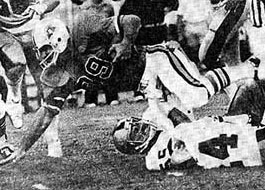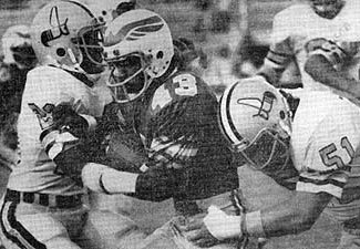 San Antonio WR Donnie Joe Morris is tackled by Ike Thomas and Jere Brown san antonio, tx.; Wings running back Billy Sadler ran for two touchdowns and quarterback Johnnie Walton scored another as the San Antonio Wings defeated the Charlotte Hornets 27-10. Sadler, who rushed for 65 yards, scored the first points of the game on a 2-yard plunge and scored again in the fourth quarter. Charlotte, lost four fumbles, three of them being converted into touchdowns and a field goal by the Wings. Charlotte quarterback Brian Dowling threw three interceptions, one of which set up the final San Antonio score. 12,357 fans welcomed the WFL to San Antonio. Charlotte Hornets; Passing - B. Dowling 13-23-178-0t-3i; T. Sherman 2-4-11-0t-0i; Rushing - D. Highsmith 16-50-1t, J. Sykes 7-27, L. Jolley 11-21, E. White 2-10, T. Sherman 1-10, B. Dowling 4-9; Receiving - K. Kapitan 3-52, D. Whyte 2-38, R. Cobb 2-37, L. Jolley 2-17, E. White 2-13, D. Highsmith 2-9, J. Thompson 1-18, J. Sykes 1-5. San Antonio Wings; Passing - J. Walton 9-21-86-0t-2i, J. Ettinger 1-3-27-0t-0i; Rushing - B. Sadler 17-65-2t, J. Strong 9-39, J. Walton 4-32-1t, D. McCall 2-21, Ed. Richardson - 1-7, J. Ettinger 1-0, S. Conley 1-1, D. Morris 1-10; Receiving - B. Sadler 3-32, J. Strong 3-26, S. Conley 2-33, Ed Richardson 2-22.