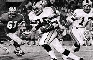 Southmen RB Larry Csonka bulls over Fred Abbott and Dennis Pete memphis, tn.; The much publicized debut of Larry Csonka, Jim Kiick and Paul Warfield occurred before 25,166 fans at Memorial Stadium in Memphis. Jim Kiick ran for a touchdown with: 38 remaining to lead the Southmen to a narrow 27-26 win over the Jacksonville Express. The Express, led by quarterback George Mira, came back on a 39-yard touchdown bomb to Dennis Hughes. With: 08 remaining, the Express ran a "action point" play to the right. Tommy Reamon was stopped inches short of the goal line, to preserve the Memphis win. Southmen running back Jim Kiick ran for three touchdowns to lead Memphis. Jacksonville Express; Passing - G. Mira 11-20-173-2t-0i; Rushing - A. Haywood 15-107, T. Reamon 16-44-1t, Receiving - D. Hughes 4-79-2t, S. Barrios 4-53, A. Haywood 2-12, W. Beckman 1-29. Memphis Southmen; Passing - J. Huarte 10-23-1441t-1i; Rushing - L. Csonka 20-99, W. Spencer 12-77, J. Kiick 15-46-2t, T. Beamer 4-32; Receiving - E. Marshall 3-55, P. Warfield 3-53, J. Kiick 2-20-1t, G. Shirk 2-16.