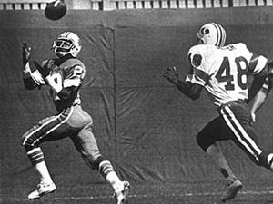 Sun WR Keith Denson hauls in a 65 yard TD pass anaheim, ca.; Sun quarterback Mike Ernst threw touchdown passes of 65 and 25 yards and led the Sun to a 21-15 win over the Portland Thunder. 13,257 fans in Anaheim watched the Thunder open the scoring when quarterback Don Horn hit tight end Bob Christensen with a 12-yard scoring pass. The Sun took a 14-8 halftime lead when Keith Denson (pictured above) caught a 65-yard bomb from Ernst. The Thunder countered when Rufus Ferguson ran six yards for a score. Sun running back Anthony Davis, who gained 102 yards on 23 carries, rolled out to his left and threw a pass to tight end Chuck Bradley who carried the ball to the Thunder nine. On the next play, Greg Herd broke through the Thunder secondary for a touchdown run and a Sun victory. Quarterback Don Horn of the Thunder completed 11 of 17 passes for 122 yards and a touchdown in a losing cause. This game was played on Sunday, August 3, 1975. Portland Thunder; Passing - D. Horn 11-17-122-1t-0i; Rushing - J. Evenson 25-76, I. Hammon 4-1; Receiving - B. Christiansen 3-38-1t, J. Thorpe 3-23, E. McCullouch 2-29, J. Evenson 2-24, I. Hammon 1-8. Southern California Sun; Passing - M. Ernst 10-19-1792t-1i, A. Davis 1-1-16-0-0; Rushing - A. Davis 23-102, M. Ernst 3-36, G. Herd 4-17, K. Denson 1-8, B. Kramer 2-5; Receiving - C. Bradley 4-61, T. Lindsey 2-56-1t, D. Williams 2-14, A. Davis 2-1, K. Denson 1-65.