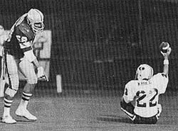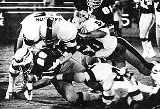 birmingham, al.; Quarterback Pat Haden recovered from a concussion and passed 35 yards to Keith Denson for a touchdown to clinch the Sun's 35-25 win over Birmingham. The loss marked the first time Birmingham has ever lost at Legion Field in league play. The teams scored a total of 36 combined points in the second quarter, but then the Sun defense shut down the Vulcans for the last two quarters. 32,000 fans attended the game in Birmingham. (Pictured above, Anthony Davis is wrestled down by Vulcans defensive tackle Jesse Wolf). Southern California Sun; Passing - P. Haden 10-16-204-2t-2i, M. Ernst 1-5-10-0t-0i; Rushing - A. Davis 22-71-2t, G. Herd 3-28-1t, G. Dixon 6-27, B. Kramer 5-17, M. Ernst 1-17; Receiving - A. Davis 5-51, C. Bradley 2-68, T. Lindsey 2-53, K. Denson 1-35-1t, D. Williams 1-7-1t. Birmingham Vulcans; Passing - D. Duron 8-22-122-1t-2i, M. Reed 0-7-0-0t-0i; Rushing - J. Musso 11-31, D. Duron 4-26, J. Profit 8-24, A. Cantrelle 9-13-1t, B. Brown 1/-3; Receiving - B. Brown 3-42, T. Powell 2-19, A. Allen 1-40, J. Musso 1-13-1t, B. Rudder 1-8.