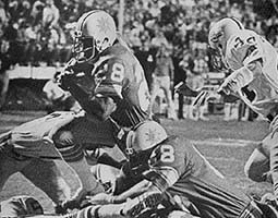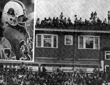 Memphis Southmen 16, Portland Thunder 3. portland, ore.; The Oregon debut of Csonka, Kiick and Warfield occurred on Sunday, September 21 at Portland's Civic Stadium before the Thunders' largest crowd of the WFL season 14,818. Memphis took advantage of three early Portland turnovers and kicker Ricky Townsend kicked three field goals to lead the Southmen. Jim Kiick plunged into the end zone from one yard out after a 57-yard run with a fumble recovery by teammate Tom Beckman for Memphis' only touchdown of the game. Paul Warfield caught five passes for 70 yards to lead Memphis receivers and quarterback Danny White completed 16 of 26 passes for 159 yards. The win lifted the Southmen to 6-1, and dropped the Thunder to 2-5. (pictured above, Portland fans sit on rooftops to get a look at Memphis' Larry Csonka, Jim Kiick and Paul Warfield during their game against the Thunder). Memphis Southmen; Passing - D. White 16-26-159-0t-0i; Rushing - D. White 7-56, W. Spencer 9-47, J. Kiick 13-38-1t, L. Csonka 3-23, J. Harvey 3-8; Receiving - P. Warfield 5-70, R. Wallace 4-48, J. Kiick 4-30, W. Spencer 3-11. Portland Thunder; Passing - D. Horn 17-29-159-0t-3i; Rushing - R. Ferguson 15-65, B. Wyatt 9-32, I. Hammon 11-31; Receiving - R. Ferguson 8-86, J. Wylie 2-26, J. Thorpe 2-20, B. Wyatt 2-13, B. Christiansen 1-8, J. Krieg 1-6.