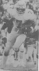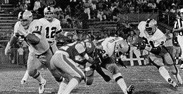 Shreveport Steamer 38, Southern California Sun 29. shreveport, la.; Quarterback Edd Hargett passed for 369 yards and three touchdowns as the Shreveport Steamer defeated the Southern California Sun 38-29 before 18,777 at State Fair Coliseum. Hargett, in danger of losing his starting role, completed 20 of 30 passes for 369 yards and led the Steamer to a 24-14 half time lead. Hargett opened the scoring with a seven-yard pass to Rory Best and then hit Rick Eber with a 11-yarder and John Odom with a 15-yarder. Eber finished the game with 7 receptions for 170 yards. Southern California Sun running back Anthony Davis rushed for 104 yards on 19 carries and scored three touchdowns in a losing cause. The game was the last for Sun quarterback Pat Haden, the WFL's leading passer, who left the team to travel to England to begin his Rhodes Scholarship studies. Sun veteran quarterback Daryle Lamonica missed the team plane and refused to return calls made to his home and apartment, further fueling rumors that Lamonica would not play for the Sun again this season. Lamonica was reportedly upset with Sun coach Tom Fears after being benched last week against Charlotte when the game was on the line. He was scheduled to play a half against the Steamer and then take over as the Sun starter next week when the team traveled to Charlotte to take on the Hornets. (Pictured above, Anthony Davis runs against the Steamer as Richmond Flowers moves in for the tackle). Southern California Sun; Passing - P. Haden 10-19-156-1t-1i; Rushing - A. Davis 19-104-3t, B. Ferrell 5-29, G. Herd 1-7, P. Haden 3-5; Receiving - T. Lindsey 5-112-1t, K. Denson 2-40, C. Bradley 2-30, A. Davis 1-9, B. Ferrell 1-0. Shreveport Steamer; Passing - E. Hargett 20-30-369-3t-0i; Rushing - J. Nance 29-64-2t, V. Robinson 15-29, R. Scales 1-8, E. Hargett 1-4; Receiving - R. Eber 5-170-1t, J. Odom 4-63-1t, V. Robinson 1-12, R. Best 1-3-1t.