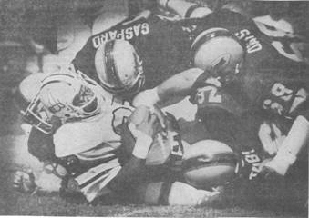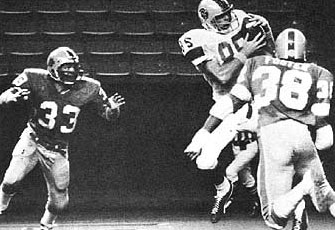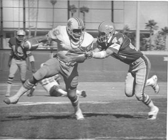 Southern California Sun 39, Shreveport Steamer 30 anaheim. ca.; Sensational rookie Anthony Davis, the WFL's leading rusher, scored twice, added two action points and gained more than 100 yards for the seventh time this season to lead the Southern California Sun to a 39-30 victory over the Shreveport Steamer. Davis, the WFL's scoring leader, ran his point total to 118 and increased his rushing total to 1,091 yards by carrying the ball 25 times for 139 yards. Benny Ricardo kicked field goals of 41, 43, and 34 yards to help the Sun improved its record to 6-5 before 10,505 fans at Anaheim Stadium. The Steamer managed 15 fourth quarter points to make the game close, as quarterback Edd Hargett completed 18 of 31 passes for 216 yards and two touchdowns. Running back Jimmy Edwards added two touchdowns of 5 and 12 yards for the Steamer in a losing effort. This game was played on Sunday, October 12. (pictured above, Sun RB Anthony Davis escapes the grasp of Steamer DB Richmond Flowers, and scores one of his two touchdowns). Southern California: Passing- M. Ernst 13-25-148-0t-1i, A. Davis 1-3-18-0t-0i; Rushing- A. Davis 25-139-2t, G. Dixon 9-31-1t, B. Ferrell 6-19-1t, M. Ernst 2-8, B. Kramer 3-6, K. Denson 1-3; Receiving- A. Davis 5-47, T. Lindsey 4-66, B. Ferrell 2-3, C. Bradley 1-18, D. Williams 1-18, K. Denson 1-15. Shreveport Steamer: Passing- E. Hargett 18-31-216-2t-1i.; Rushing- J. Nance 11-67, J. Edwards 16-34-2t, H. Brandon 1-1, E. Hargett 3-11; Receiving- R. Eber 5-59-1t, R. Scales 3-43, D. Winslow 3-32-1t, J. Odom 3-30, D. Davis 1-35, J. Nance 1-12, H. Brandon 1-9, J. Edwards 1-4.