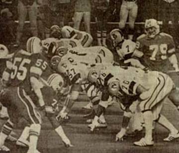 honolulu, hi.; Anthony Davis raised his WFL leading rushing total to 1,200 yards and the Southern California Sun improved its fall season record to 2-0 (7-5 overall) with a 26-7 win over the Hawaiians before 15,905 fans at Aloha Stadium. The Hawaiians played without several veterans who had left the club following midweek disruptions caused by a management request for a team pay cut. Quarterback Milt Holt, who was released by the Hawaiians in training camp, went most of the way for the Hawaiians and completed 5 of 16 passes for 101 yards and one touchdown. Jim Fassel last played for the Hawaiians in 1974. He was signed after Rick Cassata and Sonny Sixkiller left the team earlier this week. Fassel played in the final quarter and completed 1 of 3 passes for 10 yards. Sun running back Anthony Davis gained 109 yards on 23 carries and scored two touchdowns brining him within one of the WFL season record of 19 set by Memphis WR Ed Marshall last season. Davis gave the Sun a 15-0 first quarter lead with scoring runs of 15 and 2 yards. The first capped a 95-yard drive in which he contributed a 23-yard run. Davis also caught five passes for 46 yards. Anthony Davis is averaging 100 yards a game. He has 1200 yards in twelve games, and has eight games where he's rushed for 100 yards or more which is a WFL record. A.D. has also caught 40 passes this season for 381 yards and has scored 50 points more then any other player in the WFL this season. Sadly, this game would prove to be the last World Football League game ever played. (pictured above, Hawaiians quarterback Milt Holt calls play as Sun DT Pat Sweetland jumps off sides). Southern California Sun; Passing - M. Ernst 18-27-182-1t-1i, W. Estabrook 0-1-0-0t-0i, A. Davis 0-1-0-0t-0i; Rushing - A. Davis 23-109-2t, G. Dixon 4-30, M. Ernst 2-23, K. Grandberry 4-18, B. Kramer 3-14, B. Ferrell 2-10; Receiving - C. Bradley 3-51, T. Lindsey 4-48, A. Davis 5-46, D. Williams 2-19-1t, K. Denson 2-15, B. Kramer 1-8, B. Ferrell 1-5. Hawaiians; Passing - M. Holt 5-16-91-1t-1i, J. Fassel 1-3-10-0t-1i; Rushing - W. Wingard 16-50, V. Clements 6-10, T. Poe 2-15, J. Moseley 1-1, J. Fassel 1-8; Receiving - M. Donohoe 2-20, H. Bauer 1-20-1t, D. Williams 1-45, T. Poe 1-10, J. Moseley 1-6.