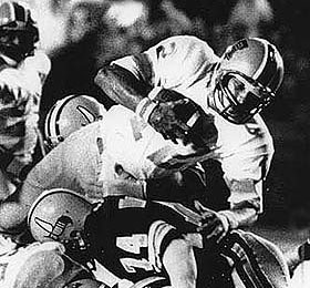Vulcan RB Art Cantrelle rushes against the Southmen birmingham, al.; The Vulcans scored two touchdowns within 1:02 of each other in the first quarter and then used a stifling defense to shut down Memphis and give Birmingham a 21-0 win over the Southmen before 35,000 at Legion Field. Vulcans quarterback Matthew Reed completed 11 of 22 passes for 164 yards and one touchdown, and led the team on touchdown drives of 64, 13 and 77 yards. The Vulcan running game continued to lead the WFL hammering out 238 yards. The Birmingham defense stung Memphis with six sacks totaling 62 yards, an interception and a goal line stand. The Vulcan defense also limited Southmen running back Larry Csonka to only 71 yards on 17 carries, while linebacker Warren Capone led the defense with 10 tackles and a crucial sack of Danny White on a third-and-goal play. The Southmen are the only team in the WFL getting sacked on more than ten percent of their passing attempts. Memphis Southmen; Passing - D. White 7-17-115-0t-1i, J. Huarte 1-4-8-0t-0i; Rushing - L. Csonka 17-71, J. Kiick 7-31, W. Spencer 2-7, J. Harvey 3-0; Receiving - J. Kiick 3-46, R. Wallace 2-25, L. Csonka 1-25, C. Hobbs 1-23, E. Marshall 1-4. Birmingham Vulcans; Passing - M. Reed 11-22-164-1t-1i; Rushing - A. Cantrelle 21-69-1t, J. Musso 16-58-1t, M. Reed 5-55, J. Profit 5-30, T. Powell 1-9, B. Rudder 1-3, D. Duron 1-3; Receiving - A. Cantrelle 3-17, J. Bishop 2-68, D. Homan 2-17, T. Powell 1-28, D. Duron 1-14-1t, R. Evans 1-10, J. Musso 1-10.