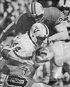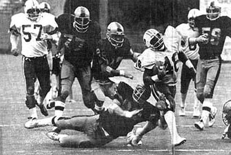 Thunder RB Rufus Ferguson rips through the Jacksonville defense portland, ore.; The Portland Thunder played 60 minutes of well-rounded football to register their second win of the WFL's Fall Season, and their second straight victory, defeating the Jacksonville Express 30-13 before 8,713 fans at Portland's Civic Stadium. The Thunder pulled out all the stops scoring four touchdowns and dominating both sides of the ball. Thunder defender Kurt Matter recovered a fumble, and Rufus Ferguson bolted 16-yards to put Portland on the board, 8-0. After Charlie Durkee added a pair of field goals for the Express, Joe Wylie returned a punt 78 yards for another Portland touchdown. The third touchdown came on a trick play, as the Thunder showed a field goal but Ira Hammond circled around after the snap to field a pitch from holder Don Horn and threw a touchdown pass to tight end Bob Christiansen. After the game, the Portland Thunder players ran a lap around Civic Stadium waving to the fans, before a standing ovation. Thunder coach Joe Gardi now has a record of 2 wins and 1 loss since taking over as head coach in week 10. Jacksonville Express; Passing - G. Mira 19-41-234-1t-1i, D. Fowler 4-11-45-0t-0i; Rushing - B. Duncan 14-31, S. Johns 7-23, J. Poulos 4-14, G. Mira 1-7; Receiving - D. Hughes 9-131, W. Beckman 6-95, B. Duncan 3-9, S. Barrios 2-22-1t, M. Creaney 1-11, J. Poulos 1-9, S. Johns 1-2. Portland Thunder; Passing - D. Horn 5-11-51-1t-1i, I. Hammon 1-1-29-1t-0i; Rushing - R. Ferguson 24-141-1t, B. Wyatt 21-59, D. Horn 3-17; Receiving - B. Christiansen 2-49-1t, R. Ferguson 2-5, E. McCullouch 1-24-1t, F. Russell 1-12.