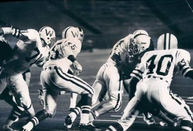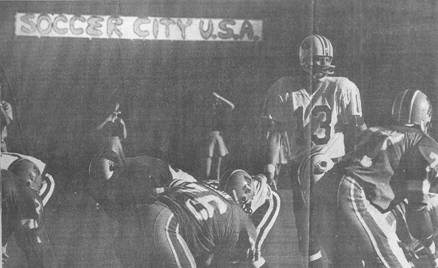 Chuck Beatty and Lonnie Warwick waiting to tackle Larry Csonka J.V. Stokes returned a kickoff for a touchdown as the San Antonio Wings defeated the Memphis Southmen 7-0 before 19,000 fans at Alamo Stadium. Southmen stars Larry Csonka, Jim Kiick and Paul Warfield were held to minimal yardage by a tough Wing defense led by Lonnie Warwick, Paul Vellano, Billy Hobbs and Billy Hayes. The WFL's color coded pants were to be used during this game, but members of the Memphis Southmen refused to wear them. Memphis Southmen; Passing - J. Huarte 7-26-91-0t-4i, L. Stewart 0-1-0-0t-0i; Rushing - L. Csonka 20-90, J. Harvey 5-19, W. Spencer 6-6, J. Kiick 2-6, J. Huarte 1-4; Receiving - L. Csonka 3-29, E. Marshall 2-48, P. Warfield 1-15, J. Harvey 1-1. San Antonio Wings; Passing - J. Walton 10-32-106-0t-4i; Rushing - B. Sadler 13-54, J. Strong 18-34, D. McCall 5-9, J. Walton 2-9, S. Conley 2-5; Receiving - B. Sadler 2-25, J. Strong 2-24, D. Shanklin 2-12, W. Frazier 1-22, D. Morris 1-12, Ed. Richardson 1-3.