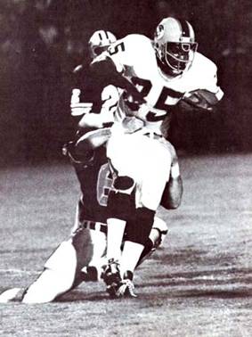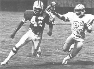 Virgil Robinson runs against Memphis Quarterback John Huarte threw two touchdown passes to Paul Warfield for a 14-7 triumph by the Memphis Southmen over the Shreveport Steamer. The winning score came with only 24 seconds left in the third period after a fumble by Shreveport's Arthur James. Huarte passed 8 yards to Warfield for the touchdown. Larry Csonka and Jim Kiick, who defected with Warfield from the NFL's Miami Dolphins, rushed for 73 and 115 yards, respectively. Memphis Southmen; Passing - J. Huarte 9-16-163-2t-1i; Rushing - J. Kiick 30-115, L. Csonka 16-73, J. Harvey 3-5; Receiving - G. Shirk 3-86, P. Warfield 2-41-2t, L. Csonka 2-16, J. Kiick 1-8. Shreveport Steamer; Passing - E. Hargett 12-23-120-1t-0i; Rushing - J. Nance 9-49, V. Robinson 15-47, H. Brandon 11-43; Receiving - G. Smith 4-33-1t, D. Winslow 3-33, J. Nance 2-23.