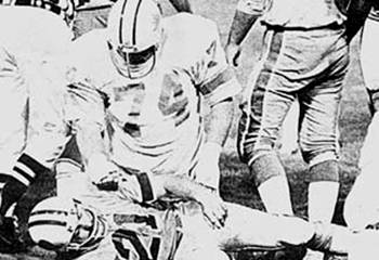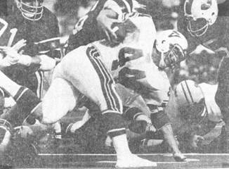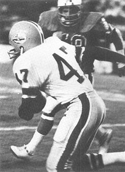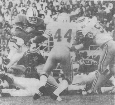 Sun DT Dave Roller welcomes Memphis RB Jim Kiick to the WFL Sun running back Anthony Davis scored 30 points (4 Touchdowns, 2 Action Points) as the Southern California Sun routed the highly-touted Memphis Southmen 47-16 before 22,705 fans in Anaheim. Davis out shined Memphis' "Big Three" of Larry Csonka, Jim Kiick and Paul Warfield scoring touchdowns from 4 yards, 3 yards, 1 yard and catching a 17-yard pass from quarterback Mike Ernst. The Sun defense limited Memphis to only 55 yards rushing as quarterback Daryle Lamonica completed 7 of 15 for 99 yards and Mike Ernst hit 10 of 14 for 155 yards for the Sun. Memphis Southmen; Passing - J. Huarte 8-13-115-1t-2i, L. Stewart 4-16-74-1t-3i; Rushing - W. Spencer 9-27, T. Beamer 6-13, L. Csonka 4-12, J. Kiick 5-3; Receiving - E. Marshall 4-68-1t, J. Kiick 3-26, W. Spencer 2-22, T. Beamer 1-38-1t, P. Warfield 1-28, G. Shirk 1-7. Southern California Sun; Passing - M. Ernst 10-14-155-3t-0i, D. Lamonica 7-15-99-0t-0i; Rushing - A. Davis 15-56-3t, B. Kramer 10-48, B. Ferrell 10-32, P. Miles 7-24, M. Ernst 1-6, G. Herd 4-4; Receiving - K. Denson 3-61-1t, T. Lindsey 2-38, B. Kramer 2-35, G. Herd 2-23, A. Davis 2-18-1t, D. Williams 2-14, C. Weatherspoon 1-40-1t, J. McKay 1-15, C. Bradley 1-7, B. Ferrell 1-3.