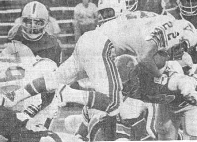 Vulcans Johnny Musso dives for yardage against the Steamer 13,214 paying customers came out to State Fair Stadium as the Birmingham Vulcans defeated the Shreveport Steamer 31-30. With eight minutes remaining in the game, Steamer quarterback Edd Hargett was blindsided and fumbled the ball on the Shreveport 27. The Vulcans, led by quarterback Matthew Reed, charged downfield and hit running back Art Cantrelle with a 16 yard pass for the go-ahead touchdown. Cantrelle finished the game with 71 yards on 19 carries. Birmingham Vulcans; Passing - M. Reed 7-16-100-1t-1i; Rushing - A. Cantrelle 19-71-1t, J. Profit 10-38, J. Musso 7-31, T. Powell 6-20, M. Reed 5-12-2t; Receiving - D. Homan 1-35, A. Cantrelle 1-16-1t, J. Musso 1-5, T. Powell 1-5, J. Profit 1-4. Shreveport Steamer; Passing - E. Hargett 8-15-98-1t-2i; Rushing - H. Brandon /74, V. Robinson /28; Receiving - R. Scales 4-44-1t.