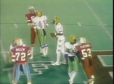 Bell and Sun Players try on color coded pants during pre-game warm ups Sun rookie running back Anthony Davis rushed for 78 yards and scored three touchdowns as Southern California defeated the Philadelphia Bell 23-8. The Sun victory was a costly one as backup quarterback Pat Haden suffered what was thought to be a shoulder separation. Haden started over starting quarterback Daryle Lamonica who had recently undergone a hernia operation. The Bell played in antiquated JFK Stadium in 1974, but switched to the University of Pennsylvania's Franklin Field for 1975. It did little help to its attendance as a paid crowd of 2,614 was announced. The Bell-Sun contest was one of the exhibition games slated for the color-coded pants. Both teams wore pants during the pre-game warmups, but refused to wear them during the game. Southern California Sun; Passing - P. Haden 8-14-118-0t-1i, M. Ernst 6-12-62—0t-0i; Rushing - A. Davis 17-78-3t, G. Dixon 17-71, B. Ferrell 6-24, G. Herd 6-20, B. Kramer 3-17, M. Ernst 1-6, P. Miles 1-3, P. Haden 1-0; Receiving - T. Lindsey 4-54, G. Herd 3-69, K. Denson 2-29, G. Dixon 2-13, J. McKay 1-12, B. Kramer 1-6, A. Davis 1-3. Philadelphia Bell; Passing - B. Davis 7-16-34-0t-0i, J. Corcoran 7-16-96-0t-0i; Rushing - J. Jennings 6-18, J. Joe 3-16, R. Holliday 1-9, A. Thompson 3-7, F. McGuigan 7-6-1t, J. Land 2-6, C. Watts 2-1; Receiving - C. Watts 3-9, B. Hawkins 2-24, F. McGuigan 2-11, L. Izzo 2-10, J. Joe 1-20, R. Holliday 1-16, D. Nogle 1-15, P. Dunn 1-15, T. Kwalick 1-10.