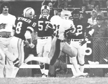 Winds John Gilliam running pass pattern against the Hornets Larry Shears Charlotte QB Brian Dowling hit WR Randy Cobb with a 47-yard touchdown pass with 1:16 remaining to complete a comeback and give the Hornets a 22-21 win over Chicago at Greensboro, North Carolina. A crowd of 2,231 watched as the Chicago Winds opened up a 21-8 lead as QB Pete Bethard hit WR John Gilliam with a TD pass and Jim Ford ran for a touchdown. Charlotte came roaring back. Dowling and the running of Don Highsmith put the Hornets in good field position for the winning score. Chicago Winds; Passing - P. Beathard 9-23-88-1t-1i; Rushing - M. Kellar 14-65, J. Ford 7-25-1t, M. Williams 7-25, C. Pinder 9-22-1t; Receiving - J. Gilliam 5-53-1t, T. Gillespie 2-20, J. Gessford 1-11, M. Kellar 1-4. Charlotte Hornets; Passing - T. Sherman 8-16-65-0t-0i, B. Dowling 6-6-86-1t-0i; Rushing - D. Highsmith 12-86-1t, E. White 9-29-1t, J. Sykes 9-24, B. Gladieux 3-14, L. Jolley 2-10, C. Bartles 2-3, T. Sherman 1-2, Smith 1-1, B. Dowling 2-1; Receiving - E.White 3-33, R. Cobb 2-66-1t, D. Whyte 2-16, B. Gladieux 2-11, J. Sykes 2-5, J. Thompson 1-19, D. Highsmith 1-8, L. Jolley 1-4.