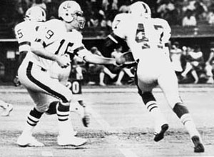 Houston Texans and former New York Jets WR Don Maynard The Texans traveled to Portland, Oregon to play the Storm. In the Western Division, the Southern California Sun and the Texans were tied for first with 2-2 won-lost records. The Texans roster had 33 of 37 players on it with prior NFL football experience, and the Texan defense was on of the WFL's best. Names like Al Dotson, Joe Robb, Jim Kanicki and Garland Boyette were familiar professional names. Before the game Portland head coach Dick Coury said, "Houston had the best defense in the league. Houston also has a lot of professional experience on defense. That is the ways to build a good winning team on any level- have a strong defense. A strong defense makes things happen and that is just what Houston is doing. Their defense has been responsible for both of their victories." While the Texan defense shook Portland to the core, the offense seemed to be lost, rolling among the Texas tumbleweeds. The offense had gained only 657 yards in four games, and scored only one touchdown (a one-yard run by Jim Nance off a John Mallory interception). In the second quarter, under the threatening gray skies in Portland, the Storm scored an 8-0 lead as Marv Kendricks dove over from the one yard line. Mike Taliaferro led the Texans back on a offensive march down the turf of Civic Stadium, that surprised the Texan coaching staff more than it did the fans. Texan running back Jim Nance slammed over from the one to tie the game at 8-8. After a scoreless third quarter, Taliaferro hit receiver Rick Eber on a 12-yard touchdown play that gave Houston a 15-8 lead. The action point (a pass) failed. The Storm, before 15,686 fans came charging back. Quarterback Ken Johnson threw a pass over the out-stretched hands of Don Brumm and into the hands of Sam Dickerson for a touchdown and a 15-15 tie. The Storm lined up at the 2 yard line for the action point and the win. Ken Johnson called the signals and handed off to Rufus Ferguson who was tackled by a legion of Texan defenders. As the final gun sounded, and the players walked among each other, the Storm and the Texans had battled each other and came up with the WFL's first and only tie 15-15. With a 2-2-1 won-lost record, the Texans prepared to face the Southern California Sun back in Houston. The Portland game gave the team reason to be hopeful. Texan quarterback Mike Taliaferro completed 11 of 22 passes for 138 yards and a touchdown. Big Jim Nance added 83 yards and Mike Richardson added 54. For the first time in their WFL season the Texans had moved the ball well. Despite being ranked dead last in offense in the WFL, Coach Jim Garret was optimistic. Off the field, Texan management arranged several promotions to improve on the low turnout (16,000) for the game against the Blazers. At the start of the WFL season, the Texans formed their team by signing NFL veterans rather than rookies out of college. They signed offensive names like Jim Nance, a former all pro running back with the Patriots, and Mike Taliaferro, who played behind Joe Namath with the New York Jets for four seasons. Defensive stars like Jim Kanicki, Don Brumm, Joe Robb, Willie Parker and Al Dotson were signed. Through the first four weeks of the WFL season the Texans had the leagues' best defense. Then things began to change, and Jim Garrett felt new faces had to be added. With the lack of offense, Garrett searched the NFL and CFL for talent. He finally worked out a trade with the Detroit Wheels for running back Warren McVea, the former All-Pro running back at the Type University of Name Houston. McVea had refused to report to the Wheels training camp and was suspended. With the WFL season five weeks old, and the Wheels suffering for financial problems, Garrett acquired McVea for $15,000 cash. McVea had the chance to give the Texans what they desperately needed- an outside running threat. In the Astrodome, the Texans hosted the Sun before an enthusiastic crowd of 31,227 on "Nickel Beer Night". Early in the first quarter, Texan quarterback Mike Taliaferro launched a 51-yard space shot into the hands of John Odom, who beat cornerback Jack Conners, to give the Texans a 7-0 lead. The Sun wouldn't respond until the third quarter, when the same Jack Conners split coverage and ran 91-yards with a punt past the Texan bench for a 7-7 tie. The Sun would eventually add a Fleming Jenson field goal and a David Williams touchdown to beat the Houston club 18-7. The game was to be the debut of star running back Warren McVea, who played professionally with Cincinnati of the NFL, but the debut was short lived as the Sun defense sent McVea to the sidelines with broken ribs after just two carries. On August 21, 1974, the WFL reported that the Florida Blazers were looking into a possible move to Atlanta due to dwindling fan support. The Detroit Wheels were considering Charlotte, North Carolina for their new home and that the New York Stars were for sale for the price of $6 million. As the landscape of the WFL threatened to change the Texans prepared for the New York Stars. Houston also made headlines, as the team announced the signing of ex- New York Jet wide receiver Don Maynard. Maynard, an All-Pro, was released by the Jets and quickly picked up by the Texans in hopes that his ability to make the big play and provide veteran leadership in the locker room would improve the team. New York City loomed in the background as underneath the Name Triborough Type Bridge the Stars and Texans went through their pregame warm-ups. Receivers ran routs and caught passes from the quarterbacks, kickers limbered their legs, linebackers stretched and running backs went through wind sprints. In the stands, 12,042 fans sat under the din of the poor lighting system of Downing Stadium, and the grinding sound of traffic above on the bridge, and watched as the players ran from shadow to shadow. The opening kickoff fell from the Manhattan skyline to the hard dirt field and from that moment the S