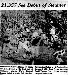 Mike Taliaferro hands off to Virgil Robinson The Texans returned home to face the Hawaiians. Only 9,061 fans sat under the roof of the Astrodome during the game. As the scattered noise of the fans echoed throughout the Astrodome, Arnold saw the writing on the wall. Three disappointing crowds (totaling only 35,000 in gross ticket sales) and high expense of running the organization was taking its toll on his checkbook. Hawaii defeated the Texans 24-17 on the passing of ex-Houston Oilers QB Edd Hargett. Despite a 131 yard rushing performance from Jim Nance the Texans fell behind Hawaii 16-7 and never caught up. Privately, Steven Arnold confided in WFL official and friend Gary Davidson, that the club was experiencing "difficulties" meeting the financial obligations on a weekly basis. Arnold had run through all his personal finances, and there weren't any rich oil tycoons lining up to invest in the team. The Texans, dying a slow death in Houston, were 3-7-1. The team began to show visible signs of financial difficulty. Owner Steven R. Arnold was reportedly in debt over $200,000 (although media reports claimed the figure was twice that amount). During the week, a Houston bus driver refused to transport the club to Name Rice Type University for practice, claiming the busing company hadn't been paid in weeks- the team had to cancel practice. Several small business' in the Houston area were calling the Texan offices in regard to unpaid bills. Badly in need of financial help, Arnold began talks with officials of Shreveport, Louisiana about a possible sale of the franchise. The local merchants of the city pooled their funds and made Arnold an offer to sell the team outright. He jumped at the chance. The transfer of the Texans was kept private until ownership could be finalized and the agreement that materialized allowed the team to be "held" by Louisiana banker Bill Bernard until he could raise the needed cash for the purchase of the team. Steven Arnold would be allowed to walk away from the Texans and the WFL. The Texans' sale to the Shreveport investment group hit a snag when Judge Arthur Lesher ordered the Texans to play one more game in the Astrodome. The temporary restraining order blocked the WFL's attempt to have the Texans first home game in Shreveport against the Memphis Southmen. L.A., Frey and Company, a New Orleans meat products concern, sought the order contending such action would damage a ticket promotion it was sponsoring. The promotion permitted fans to get an $8 ticket for $1 and four labels from Frey products. The WFL moved in quickly to try to settle the suit and eventually, the WFL would win an injunction to have the game moved to Shreveport. Amid the confusion and the mounting financial problems of Arnold and the WFL, the Texan players were gathered together at a team meeting and told about the sale and transfer of the club to Shreveport. The announcement was not a popular one with some of the players. Mike Taliaferro, the Texans starting quarterback, refused to go to Shreveport. Taliaferro told reporters, "I will not go due to personal reasons. The only way I could stay in professional football was to stay in Houston." Coach Jim Garrett was suspended after reportedly urging the team not to report to Shreveport, calling the city "rinky dink". Public relations man for the Texans, Jack Cherry, said Garrett's' suspension came for a "number of reasons." Many of the Texan players were privately against the move. Houston was a major city, a professional sports city, and some players didn't think that playing on the banks of the river at the foot of "Twelve mile Bayou" was where their professional careers would take them. Later in the week, the chaos reached a pinnacle when a national college football ranking company rated Houston/Shreveport as the worst college football team in the country. In the Houston Chronicle it was reported, "The Texans left town the same way they came, broke, disorganized and unwanted." The next week the Louisiana WFL franchise, as they were referred to, lost to Birmingham 42-14. The game was the TVS "Game of the Week" and referred to the Texans as "Louisiana" throughout the game. The press and media referred to the team as the " Louisiana Purchase" due to the fact that they were the first WFL team to change cities. On the field, " Louisiana", coached by Henry Lee Parker (in place of suspended Jim Garrett), trailed the Americans only 15-14 at the half. In the third quarter, the Americans erupted for 11 points and continued into the fourth with another 16 points to put the game out of reach. "Louisiana" was 3-8-1, scoring an average of 10.27 points a game, and seemingly lost in a storm of confusion and discontent but the storm was about to pass. In Shreveport, the Louisiana WFL franchise was represented by Shreveport banker Bill Bernard. Bernard organized a group of local investors for the team. It was also announced that Bernard would also be offering public stock in the team in hopes to raise about $2 million for the franchise. On September 25, 1974, the town of Shreveport held a parade welcoming the Houston Texans to their city. A local "Name the Team" contest came up with the moniker, "The Steamer", after the city's rich riverboat heritage. Amid the marching bands, the city streets lined with fans and the carnival-like atmosphere, Shreveport had its team, and Houston had the ghost of the WFL and a legacy of empty Astrodome seats.