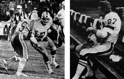 Texan-Steamer running back Jim Nance and the infamous John Matuszak The win against the Philadelphia Bell was an important road victory but nothing would match the next Steamer contest. 24,617 fans packed into State Fair Stadium to watch the Steamer play the first-place Birmingham Americans. After a scoreless first quarter, Shreveport's Jim Nance ran over the Americans defensive line for a 7-0 Steamer lead. The crowd erupted into a thunder that shook the building to its foundations. Minutes later, Steamer kicker Charlie Durkee booted a 44-yard field goal and the home team had a 10-0 half time lead. In the locker room coach Marshall Taylor rallied his troops. "No mistakes, keep the pressure on the quarterback, we can win this one!" The Steamer players ran back onto the field as the cheers from the hometown faithful echoed throughout the Louisiana night. The fans sounded as if there were 50,000 in the stands. In the third quarter, after an impressive drive, Paul Gibson ran for a one yard touchdown through the blue and red American defense for a 17-0 Shreveport lead. Birmingham searched for answers as quarterbacks Matthew Reed and George Mira were unable to move the offense. In the fourth quarter, David Mays ran an option play and found a streaking Doug Winslow for a 15-yard touchdown pass and a 24-0 Shreveport lead. The noise in the stadium was deafening, the Steamer defense started to throttle the American running backs with punishing gang tackles. Late in the game, Doug Winslow ran 13 yards as the Steamer routed the Birmingham Americans 31-0. The team had avenged its 42-14 loss to the Americans. Shreveport was 6-10-1. The win over Birmingham was a huge game for the Steamer. The WFL announced a new playoff format that would feature team with the best second half record, along with the division winners. With this plan, the Steamer held a 3-4 second half record and could easily make it into the playoffs if they continued to win. With hopes of a WFL playoff spot still possible the Steamer met the only team that stood in their way, the Portland Storm. Another spectacular crowd of 20,402 came out to State Fair Stadium. The fans cheered on their heroes but the Steamer fell to Portland 14-0. Shreveport played flat the entire game as Storm quarterback Pete Beathard threw for two touchdowns to Rufus Ferguson for the victory. As the WFL season came to a close, the enthusiasm of the Louisiana fans did as well. The city had supported the team (averaging over 20,000 a game) but the club posted a 6-11-1 mark and the WFL was starting to suffer from its own bad press. The Steamer played its last home game against the Charlotte Hornets, who started the season in New York, and drew a disappointing 10,697 fans for a 19-14 win. The Steamer clinched the win on Jim Nance's two yard touchdown in the fourth quarter but the loss to Portland meant the team was eliminated from the WFL playoffs. In the Shreveport papers under the heading, "WFL Soap Opera" the woes of the league were detailed. It was reported that attendance figures for the Steamer were inflated- the ghost of "Papergate" had come back to haunt the WFL. The owners of the team were involved in a difficult stock transaction plan and, under advisement of the league, inflated the gate figures. It was announced that the gate for the Steamer game against Memphis on September 25th actually drew a paid attendance of only 13,199 and not 21,357 as announced. The game between the Steamer and the Detroit Wheels attracted 10,792 and not the 22,012 that was announced. Several thousand tickets had been offered at reduced prices as well. Whether the figures were inflated or not, the fans of the team were excited and proud of the club. Many fans looked with hope to the 1975 season, if there was one. The article went on to detail the financial woes of the Florida Blazers (who hadn't been paid in months), the possible purchase of the Jacksonville Sharks for the 1975 season, the mounting financial problems of the Charlotte Hornets and the Portland Storm, and the "bailout" of the Chicago Fire and owner Tom Origer by other WFL owners. The stage was set for the final curtain on the WFL in its comic tragedy. The Steamer played their last game of the WFL season in Birmingham, Alabama. The Americans, tuning up for the WFL playoffs, routed the punch less Shreveport team 40-7. Shreveport ended the '74 season at 7-12-1.
