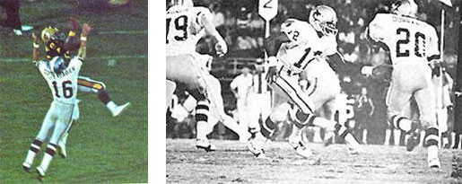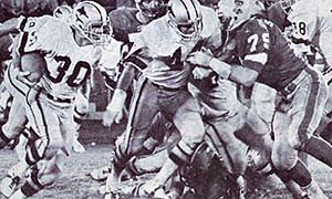 Ron Coppenbarger defends against Hawaii, Reggie Oliver hands off to Tommy Durrance Jacksonville was 2-3, and still feeling the effects of their come-from-behind victory over Hawaii, as they traveled south to face in-state rivals the Florida Blazers in Orlando. The Sharks coaching staff learned that Eddie McAshan, hero of the Hawaii game, would not be able to play against Florida due re-injuring his shoulder. Off the field, the Blazers, only five games into the season, were already reportedly looking for another home. Dismal crowds at the Tangerine Bowl (about 12,000 a game) were prompting management to look to Tampa, Florida and Atlanta, Georgia for possible "home" games. An incredible crowd of 23,890 packed the Tangerine Bowl as the two teams faced off in the first game of an in-state rivalry. The Blazers cruised out to a 31-11 lead before the Sharks raged back. Jacksonville, stumbling through three quarters, benched quarterback Kay Stephenson after two quick interceptions, and sent in rookie Reggie Oliver. Oliver was then replaced by veteran John Stofa, but returned to the game when Stofa was ineffective. He ignited the Sharks. Oliver scored on a 10-yard touchdown run early in the fourth quarter to cut the Blazer lead to 31-19. Moments later, Blazers' Erne Calloway and John Ricca blew in and sacked Oliver for a safety and a 33-19 Florida lead. The Sharks came back. Oliver hit Tom Whittier on a 6-yard touchdown pass that made the score 33-26 with just 2:23 left in the game. This time the Blazer defense held. Larry Ely, who had 10 tackles and 2 sacks, led the hard-hitting Blazers. Jacksonville scrambled, trying desperately to fight back. As the final gun sounded, Oliver hit Tom Whittier with a long pass down to the Blazer 30, but it was too little to late. "If we'd had 30 more seconds, I think we would have won the game," said coach Bud Asher, referring to the Oliver-to-Whittier pass as the final gun sounded. The coach praised his rookie quarterback Reggie Oliver, who directed the desperation march. The Sharks fell to 2-4. During the week, Sharks owner Fran Monaco decided to make a move. Monaco, concerned over the play of his team, fired old-time friend and head coach Bud Asher. The team was shocked. Monaco told the media that the team "needs a change" and that Asher had lost too many games at the last minute. The Sharks and the WFL were a risky investment, and nothing filled the house more than a winning football team. Asher was the first-ever head coach to be fired in the WFL. Owner Fran Monaco named Charlie Tate the new coach of the Jacksonville Sharks. The Jacksonville Sharks faced what was perhaps their biggest challenge of the WFL season- the undefeated Birmingham Americans. " Birmingham's offense is awesome. They have two good quarterbacks in George Mira and Matthew Reed, and Paul Robinson is a great running back," said coach Charlie Tate. The Americans had the top offensive team in the WFL, averaging over 360 yards a game. The Sharks would counter with Tommy Durrance, the WFL rushing leader with 443 yards on 123 carries, and Shark cornerback Alvin Wyatt who was rated second in the WFL with 4 interceptions. 27,140 Jacksonville fans welcomed new head coach Charlie Tate and the Birmingham Americans to the Gator Bowl. The Americans, leading the WFL with a perfect 6-0 record, featured "The Matador" George Mira at quarterback. Mira, a 10-year veteran had led the Americans to several wins in their maiden season. Mira's understudy, Matthew Reed, was earning a reputation as the best reliever in the WFL. When Mira was injured or faltered, Reed was always ready to come in. Reed had directed the Americans to two wins (both over Detroit) in the final minutes. From the opening kickoff the Sharks fought Birmingham tooth-and-nail. Neither team could establish a running game and that left quarterbacks Reggie Oliver and George Mira dueling for supremacy. Late in the first quarter, Shark kicker Grant Guthrie booted a 31-yard field goal, giving the Sharks a early 3-0 lead. In the third quarter, Grant Guthrie kicked a 51-yard field goal for a 6-0 Sharks lead. In the fourth quarter both teams began to move the ball and the game started. Quarterback George Mira was injured on a blitz by Jacksonville, and American coach Jack Gotta sent in rookie Matthew Reed. Reed wasted no time turning around the Birmingham fortunes. Driving the Americans with precision passing and running, Reed drove the Americans through Shark territory. At the Jacksonville 27, Reed hit receiver Alfred Jenkins for a touchdown and a 7-6 lead. The Sharks struck back. Rookie Reggie Oliver, from Name Marshall Name College, marched the Sharks down field, 88 yards, to the Birmingham 5. With 1:09 left in the game, running back Tommy Durrance swept right, avoided a rush of Birmingham defenders and dove into the end zone. The 27,000 fans leapt to their feet, Fran Monaco let out a scream on the sidelines and Jacksonville led 14-7. The Jacksonville faithful had seen this before. Final minutes, Sharks leading, opposing team with the ball, the ghost of defeat was coming back to haunt them again. American Jimmy Edwards gathered in the kickoff and ran straight up field, broke a tackle, found an alley in the Sharks' return coverage, and nearly ran the kickoff back for a touchdown- he was caught from behind at the Jacksonville 47 admist gasps from the Shark sideline. Matthew Reed, calm and alert, gathered the Americans around him and began to get the ball down field. On the first play of the drive, Reed took the snap, dropped back and threw a screen pass to Paul Robinson who turned up field and ran for 11 yards to the Jacksonville 36. Reed than faded back and hit Denny Duron, in coverage, over the middle at the Jacksonville 25. The crowd was going insane. Charlie Tate screamed at his defense to hold the Americans. Birmingham broke the huddle, lined up against the Sharks, and Reed dropped back. The Sharks came with an all-out blitz, and Reed barely go