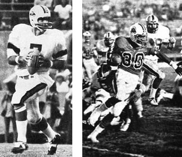 Memphis Southmen John Huarte and John Harvey In the WFL’s Central Division playing well wasn’t enough. The Birmingham Americans were undefeated and showed no signs of slowing down. Led by veteran quarterback George Mira the Americans were 6-0 and one of the toughest teams in the WFL. The Chicago Fire was also tearing up the WFL. Quarterback Virgil Carter was shredding defenses with his passing, and running back Mark Kellar was bull-dozing his way to countless touchdowns. Coach John McVay knew that consistency would be the key to the "Grizzlies" success in such a tough division. McVay and his staff planned to get the veterans playing well and substitute in rookies for experience. With the WFL season 20 games long depth in the roster would be essential. 25,123 fans came out as Memphis set a WFL record for most points scored by one team in a 60-8 rout of the Hawaiians. The "Grizzlies" exploded for 21 points in the first quarter as John Huarte threw three touchdown passes, two to Ed Marshall and one to J.J. Jennings. The defense also got in the game with Dick Thornton and Bobby Majors returning interceptions for touchdowns. The Southmen led 39-0 at half time and 53-8 going into the fourth quarter. The "Grizzlies" were 5-2. After the Hawaii game, the "Grizzlies" boarded a plane bound for Orlando, Florida for a game against the Florida Blazers. Florida was in first place in the Eastern Division with a 6-1 won-lost record and the "Grizzlies" were keeping pace with Chicago and Birmingham in the WFL’s Central Division. John McVay brought to Orlando an offensive team that averaging 364 yards a game and 31.4 points a game. Behind the hard-charging of running back John Harvey (18 carries for 135 yards) and rookie phenom J.J. Jennings (18 carries for 73 yards) the Memphis stung the Florida defense (number one in the WFL) for 251 yards rushing. The running attack opened up the airways for John Huarte who completed 12 passes for 83 yards and a touchdown. The "Grizzlies" jumped out to 18-10 lead at half time, much to the disappointment of the 17,000 Blazer fans, and never looked back until late in the game. In the third quarter, Memphis added another touchdown. Quarterback John Huarte calmly led the Southmen 96 yards in 15 plays. John Harvey and JJ Jennings plowed down to the Blazer 37, where on third and 12 Huarte found Ed Marshall for 18 yards and a first down. Then rookie Willie Spencer crashed through the Blazer defensive line for a 26-10 Memphis lead. With time dwindling in the fourth, Bob Davis began attacking the WFL’s lowest rated pass defense. Florida’s receiving corps was reinforced with Hubie Bryant and Gary Collins, and led the Blazers on a 6-play 64-yard drive that ended with Davis hitting Collins in the end zone to cut the Memphis lead to 26-18. With Florida again threatening, after a bad Southmen punt, quarterback Bob Davis drove the team down the field into Memphis territory. The 17,000 Blazer fans were on their feet as Florida alternated between Tommy Reamon running seeps behind the blocking of Jim Strong and Davis throwing to his receivers. With: 44 seconds remaining, Bob Davis and the Blazers awaited the play from offensive coach Dick Quick. The crowd was on its feet. The sounds of screaming fans, horns, and clapping filled the air around the Tangerine Bowl. The Blazers gathered together for the huddle. Bob Davis looked up at the Blazer players, "OK guys here it is…….let’s finish the job." Davis called a pass play to Hubie Bryant. Calling the signals, Davis took the snap and dropped back against a fierce pass rush from Festus Cotton and John LeHeup. Davis looked left, then right and threw a pass to the sideline intended for Bryant. As Bryant turned for the pass, Memphis cornerback Dick "The Trick" Thornton jumped in front of Bryant for the interception to clinch the victory. Southmen coach John McVay told the press after the game, "This was a great football game in every aspect- lots of exciting plays for the fans, some suspense and virtually no dull moments. But then again this is a good solid league." When reporters asked if the WFL compared to the AFL McVay snorted, "There’s no comparison. We’re way ahead in all respects. The WFL is exciting and tonight’s game is the perfect example. Our league is well-organized, well founded and well-run. It’ll get better too." The "Grizzlies" posted a 6-2 won-lost record and were becoming one of the most dangerous offensive and defensive teams in the WFL. Memphis continued to push through the season with a 16-13 victory in Jacksonville against the Sharks, and a home win over the Houston Texans 45-0. The Southmen defense was stifling all evening and never let Houston past the 50 yard line until late in the game. The victory over the Texans, coupled with Chicago’s loss to Birmingham put Memphis into second place with a 8-2 record. On September 11, 1974 the Southmen (8-2) faced the first place Birmingham Americans (10-0) in Memphis. Earlier in the season Birmingham laid a whipping on the Memphis team (58-33) that was not quickly forgotten. In the local press the Southmen players promised that revenge. "The Southmen shall rise again" was the city’s battle cry, and it flew on several home-made banners at Memorial Stadium. 30,675 fans, that sounded more like 100,000, packed Memorial Stadium. From the opening kickoff Memphis had something to prove. John Huarte quickly moved the Southmen downfield, and rookie Willie Spencer bolted in for a one yard touchdown and a 7-0 lead. After a Birmingham punt, the Southmen came right back. Again Haurte hit Ed Marshall and Gary Shirk with short passes and the running game tore through the Americans front four. On a draw play, J.J. Jennings ran up the middle and Memphis had a 14-0 lead. Memphis added another score when Gary Shirk caught a 20-yard touchdown pass from Huarte, the action point was good and the rout was on 22-0. The Americans added a score before the half and cut the lead to 22