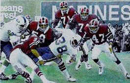 Marv Kendricks runs against the Chicago Fire The Storm played its second home game against the Philadelphia Bell. Dick Coury and his staff looked to avenge the earlier 33-8 drubbing they received from the Philadelphians. Telling reporters that the Storm was a "much improved team since it opened the WFL season", Coury worked on preparing the Storm defense for Ron Waller's innovation offensive formations. The Storm also added three proven football veterans to their roster; cornerback Frank Andruski, kicker Booth Lusteg and wide receiver Ken Matthews. Andruski added veteran leadership to the Storm secondary after playing one year for the San Francisco 49ers and eight year with the Calgary Stampeders of the CFL. Matthews, a six-time all-star with Calgary of the CFL and Lusteg, a veteran of the Buffalo Bills of the NFL added a much-needed punch to the offense. Despite the additions of veteran players, the Bell ran roughshod over the Storm for a 25-7 win. Portland was 0-4. On August 7, 1974 the Storm, looking for their first win, hosted the Houston Texans. Houston brought a roster loaded with veteran talent, 33 of their 37 players had NFL experience, and a 2-2 won-lost record. Dick Coury told reporters, "Houston had the best defense in the WFL. Houston has a lot of professional experience on the defense. That is the way to build a good winning team on any level- has a strong defense. A strong defense makes things happen and that is just what Houston is doing. Their defense has been responsible for both of their victories." Storm GM Ron Mix also added former Oregon State All-American linebacker Steve Brown and running back Cleo House, from Toronto of the CFL, in hopes of improving the play on the field. The Storm also would benefit from the return of starting quarterback Ken Johnson. The Storm offense was futile. Averaging only 11 points a game, defenses zeroed in on speedy running back Rufus Ferguson and stopped the Storm dead in its tracks. The injury to starting quarterback Ken Johnson, gave way to Greg Barton who was in turn replaced by Ken Johnson. Johnson, in the third quarter against the Texans, threw a pass over the hands of Texan cornerback John Mallory to Strom running back Marv Kendricks to tie Houston 15-15. Coach Dick Coury, who would rather have had the win, took the tie as an opportunity to build on. The Storm was in last place since the first week and would only climb out of that position twice all season. As their chartered flight landed at LaGuardia Airport, the Storm boarded a chartered bus for the ride into the sprawling metropolis of New York City. Riding beneath the massive buildings of glass and steel, the players and coaches prepared for the game with the New York Stars. New York was coming into the game with 3-2 won-lost record, and fresh off a cliff-hanger victory over the Jacksonville Sharks. Downing Stadium came alive as the sky grew dark around the city. 16,222 fans scattered around the stadium and witnessed a game that was one-sided from the start. Only five minutes into the game, the Storm's Darren Mitchell set back to receive a Star punt. As the ball traveled through the din of the Downing Stadium lights, Mitchell lost sight of the kick and fumbled the punt on Portland's five yard line. The Stars recovered and quarterback Tom Sherman rolled out and ran for a four-yard touchdown to give the New Yorkers a 8-0 lead. New York answered again, after thwarting a Portland drive, the Stars marched 74-yards in eight plays, and Tom Sherman hit a diving George Sauer in the corner of the end zone with: 15 remaining in the quarter for a 16-0 New York lead. The Stars added another second quarter touchdown on a Andy Huff four-yard run to take a 23-0 lead into the locker room at halftime. Dick Coury desperately tried to rally his players. The Storm offense was so ineffective the defense had spent much of the game on the field and, due to exhaustion, was giving up big plays and getting crushed by the Stars' running attack of Bob Gladieux and Andy Huff. The second half was much of the same as the Storm burned out in the shadows of Downing and fell to the Stars 38-16, their scores coming late in the game on touchdown passes from Greg Barton to Ken Matthews and Jim Krieg. August 21, 1974, saw the Storm travel to Orlando, Florida for a game against the Eastern Division leading Florida Blazers. With the WFL season still young, the game was shrouded by a surfacing report that the Blazers, due to low attendance, were negotiating with officials from Atlanta, Georgia for a possible move to that city. The Orlando Sentinel also reported that General Manager Rommie Loudd had scheduled meetings with civic leaders in Tampa, Florida about moving some of the Blazers games to that city. Amidst the rumors, two teams limbered up on the Tangerine Bowl field with no fewer than 15,000 fans in the stands and several home-made banners hanging around the stadium stating, "Atlanta Go Home" and "Florida Blazers not Georgia Blazers". The Storm posted a 0-7-1 record the first eight games of the season. The team was drawing only 14,000 a game in Portland and the future began to look bleak. Many of the WFL teams were struggling with financial situations. One team that was notorious for such difficulties was the Detroit Wheels. The Storm traveled to a little town called London, Ontario for a scheduled game against the Wheels. As the players walked out onto the field of aptly named J.W. Little Stadium (capacity 20,000), they noticed that the stands were practically empty during the warm-ups. The teams had scheduled the game (dubbed as the "Battle of the Beaten" by sports writers) in London for the promise of a $30,000 payday from local promoters and as a favor to Portland owner Bob Harris. Harris, a London, Ontario native wanted to move the Storm to the Canadian town and rename it the "Lords"- the announced attendance was slightly over 5,000 although reports had the attendance at only 2,000. Rufus Ferguson set up
