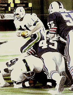 Legendary NFL linebacker Ben Davidson and running back Rufus "The Roadrunner" Ferguson led Portland to a 7-5 second half record in the WFL and upset victories over Birmingham and Memphis Facing the New York Stars, the Storm suffered a difficult loss, 34-15 in front of only 13,339 fans at Civic Stadium and fell to 2-8-1. The game against the New York Stars was a significant one for the Storm due to the fact it marked the arrival of quarterback Pete Beathard. Pete Beathard was signed to a WFL contract after being cut form the Kansas City Chiefs training camp in 1974. Ron Mix signed Beathard and brought him to Portland to give the punchless Storm offense a threat to go along with running back Rufus Ferguson. In his first game against the Stars he came off the bench in the fourth quarter and on his first snap from center turned, and fumbled the ball with the New York Stars recovering. Ex-NFL great Ben Davidson, who also played for the Storm, walked over to Beathard on the sidelines after the play and calmly said, "Don't worry about it Pete. If this team is going to elect a most improved player, you're bound to win it." Beathard would end up rallying the Storm from a 2-8-1 start, to win five out of their next nine games, including upsets over Birmingham and Memphis. On a trip the following week to Jacksonville, Florida to play the Sharks, Booth Lusteg added the winning score on a 28-yard field goal as the final gun sounded to give the Storm a 19-17 win. Portland had driven back late in the game for the winning kick on a drive led by new quarterback Pete Beathard. The Storm defense was credited with holding off a late Sharks rally to clinch the victory. Portland had now won three of its last four games and was picking up strength and momentum as a result of several new players. Ron Mix and Dick Coury added players to the Storm roster at an unbelievable rate- close to 20 roster moves just over half way through the season. Portland added linebacker Ron Guidry and running backs Wayne Patrick and Robert Holmes to add more strength to the team. September 26, 1974, was the Storms' greatest moment in their history. Portland 3-8-1, faced the mighty Birmingham Americans, 10-1, at Civic Stadium. Under the lights, the announced crowd of 14,273 watched their team battle the WFL's perennial favorites. Strom quarterback Pete Beathard, who was signed out of the Kansas City Chiefs camp, captained a ball control offense; using Rufus Ferguson and Marv Kendricks to run, and throwing short passes to receivers Jim Krieg, Greg Specht and tight-end Bob Christensen. Portland opened the scoring when Kendricks plunged over the goal-line on a 9-yard run for a 8-0 lead. Then the Storm came right back. Beathard drove the team down the field and on a quarterback sneak, dove for another score as the Civic Stadium crowd erupted. Portland led 15-0. The Americans were caught by surprise, and managed to score when rookie quarterback Matthew Reed hit Dennis Homan with a 24-yard scoring pass as time ran out in the half. As both teams walked to the locker rooms the Storm led 15-7. An upset was in their grasp. In the second half, Booth Lusteg kicked a 19-yard field goal, and the Storm increased its lead to 18-7. Then Portland Storm quarterback Pete Beathard then made his only mistake of the game. Dropping back to pass, at the Storm 21-yard line, Beathard threw a pass that was intercepted by American Steve Williams. Williams returned the pass for a touchdown, the conversion point failed and the Storm lead was cut to 18-14. With time running out, Americans Coach Jack Gotta, decided to replace Reed with veteran quarterback George Mira. Mira came off the bench and led Birmingham back on a rally that would almost steal the game away from Portland. Mira drove the Americans down the field and Charlie Harraway ran a sweep to the right over the Portland line to give the Americans a 21-18 lead. The Portland crowd fell silent, many Storm fans thinking the game was lost. Storm Head Coach Dick Coury started sending in offensive plays designed to get his team big yardage fast. Beathard began throwing the ball down field to Jim Krieg and Greg Specht, and soon the Storm were in Birmingham territory. With 35 seconds remaining in the game, Beathard hit tight-end Bob Christensen with a 16-yard pass for the go-ahead score. The Storm added the action point and led 26-21. Civic Stadium rocked with the feeling that an upset was guaranteed. In the final seconds, Portland fans watched as Birmingham quarterback George Mira fired a desperation pass into the end zone that fell incomplete. The Storm, in one of their most exciting games of the young season, had upset the best team in the World Football League. After the game, Coach Dick Coury told reporters, "what a difference, a tremendous difference with an experienced quarterback such as Pete (Beathard). I don't mind saying I think he's the best quarterback in the WFL." Coury went on to add, "We so improved, so much more experienced than when we began. I sure wish we had this crew to start with, Beathard was great. I just can't imagine how Kansas City could part with him. And Christensen's catch in the end zone was just super. Our defense was just super. They hold together, that's what I like about them." Portland was now 4-8-1 and looking towards a possible playoff spot. The Storm hosted the Southern California Sun, and before the largest crowd ever to see a football game in Portland (20,469) erupted to a 22-11 half-time led but was throttled by a aggressive Sun defense. Southern California came back on the arm of quarterback Tony Adams. Trailing 22-18, Adams hit wide receiver Keith Denson with a 35-yard touchdown pass with 1:56 remaining to take the lead 26-22. Quarterback Pete Beathard regrouped the Storm for Portland's last chance. From his 33, with 1:50 to go, Beathard needed a fourth-and-10 swing pass to his fullback, Wayne Patrick, to get a first down at the Sun 41. Then, with: 51 remaining in the gam