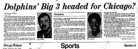 Chicago Tribune article on Larry Csonka, Jim Kiick and Paul Warfield headed to the Winds Gene Pullano then moved to secure the rights to star quarterback Joe Namath. "Broadway Joe" had just played out his option with the New York Jets, and had thrown 26 touchdown passes for one of his best seasons in the NFL. Pullano offered Namath a four-year, $4 million dollar contract (compared to the Jets $1 million offer) and even selected the colors of green and white for his team. After a series of negotiations with Namath and his agent, Jimmy Walsh, "Broadway Joe" decided to remain in the NFL. Chicago did manage to secure the services of All-Pro wide receiver John Gilliam from the Hawaiians for $25,000. The Winds announced that their head coach would be former Stars/Hornets head coach Babe Parilli. Days prior to the start of the 1975 season, the Winds fired Parilli in a bizarre turn of events and hired former Memphis general manager Leo Cahill and former Bears coach Abe Gibron. Gene Pullano told WFL officials that he was worried the "team was too weak", and wanted to make a move to secure the Winds future in Chicago.