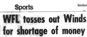 The Chicago Tribune announces the death of the Chicago Winds Winds General Manager Leo Cahill gathered the Winds players together at their Des Plaines office on Tuesday morning to let them know of the WFL's decision. Formal notice that the franchise had been revoked had come from WFL commissioner Chris Hemmeter in New York. Hemmeter said the WFL governors voted to oust the Winds at a lengthy meeting after two investors withdrew their backing. Hemmeter said the move left the Winds below the capitalization limits under the so-called "Hemmeter Plan", a stringent financial setup. "The revocation of the Chicago franchise is an example of the true strength of the Hemmeter Plan in action," said the commissioner. "The plan does not allow any team, irrespective of the size of its market, to vary from the precepts agreed to by all members." Many of the Winds players were dispersed throughout the WFL in a draft, with priority going to the Portland Thunder and the Philadelphia Bell. Winds fullback Mark Kellar, who kept muttering, "I thought this season would be different, really I did." was drafted by the San Antonio Wings. Quarterback Pete Beathard and ALL-Pro wide receiver John Gilliam were both selected by the Philadelphia Bell. Gilliam, the WFL's leading receiver, was not bound to move to another WFL team. He was given an extra $25,000 to allow his contract to be assigned to Chicago from Hawaii. Winds played mulled around the offices at Des Plaines, trying to contact their new teams, or phoning home, before Cahill told them he would advise them what to do the next day. Cahill pledged to find new investors for the team before leaving for Canada. Winds coach Abe Gibron was more stunned. He learned of the league's decision from the equipment man, and then left for his hometown of Michigan City, Indiana. Chicago's problem was in its basic internal structure, according to Hemmeter. Because of continuing difficulties surrounding partnership arrangements, two investors pulled out. When Pullano petitioned the WFL for more time to locate new funding, the WFL refused and voted 10-1 (with only the Winds in the minority) to disband the franchise. The WFL had its first victim of the '75 season. Dispersal Draft: Birmingham Vulcans: LB Van DeCree, WR Tim Gillespie, DT Mark Ilgrenfritz, DB Richard Marks. Charlotte Hornets: C Mike Botts, DB Harry Howard, RB Matthew Williams Hawaiians: TE Don Burchfield, RB David Gagnon, P/K Earl Sark Jacksonville Express: OT Tom Forrest, TE Fred Pagac, DB Bill West, DB Russell Williams Philadelphia Bell: QB Pete Beathard, WR John Gilliam, OT Steve Kinney, RB Cyril Pinder, LB Tom Roussel, DT Ken Sanduk, LB Clyde Simonton, LB David Smith, OG Mike Wilson Memphis Southmen: LB Rich Griffith, LB Larry Shorty San Antonio Wings: WR Margene Atkins, DE Chuck Bailey, DE Larry Jameson, RB Mark Kellar, DT Bill Line, DB Hal Phillips Shreveport Steamer: DE Alan Aldrich, DT Ron Curl, C Guy Murdock, DB Charlie Reamon, DB Walter Rhone Southern California Sun: OG Mike Hoban, OT Al Jenkins, LB Chuck Kogut