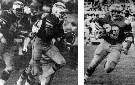 San Antonio Wings quarterback Johnnie Walton and running back Billy Sadler On a balmy Carolina night, 8,447 fans sat in the stands of Charlotte Memorial Stadium as the Hornets and Wings prepared for a game that would provide as much heat as the weather. The script was followed line by line. The Wings defense came up with a big interception when Billy Hayes stepped in front of a Tom Sherman pass to give San Antonio the ball. The Wings then marched downfield and sent Bill Sadler through the line for a 7-0 lead. Charlotte answered back in the second quarter with a drive that went 68-yards in 12 plays and ended with Don Highsmith crashing over from 5-yards out for a 7-7 tie. Veteran quarterback Tom Sherman then hit Kreg Kapitan for the action point and a 8-7 lead. The Wings added a Luther Palmer 34-yard field goal for a 10-8 lead, and then struck again as Johnnie Walton found Eddie Richardson behind coverage for a 13-yard touchdown that seemingly broke the backs of the Charlotte Hornet team. The Wings led 17-8 at half time. That set the stage for a wild, wide-open, all-out second half. San Antonio continued to dominate in the third quarter. The defense was relentless, and the Hornets couldn't sustain a drive. Luther Palmer added a 37-yard field goal as the Wings carried a 20-8 lead into the fourth quarter. The Wings stood confident on the sidelines, but their house of cards was about to fall in from the weight of a strong-armed quarterback from Virginia- Tom Sherman. Sherman came to the line as the third quarter ended, took the snap and found a streaking Lewis Jolley over the middle for a 51-yard gain to the Wings' 11 yard line. On the next play, under the thundering sound of 8,447 Hornet fans, Jolley ripped around right end for an 11-yard touchdown run to cut the San Antonio lead to 20-16. "Right there is where the game turned," claimed Wing coach Perry Moss after the game. He was right. On the following play, Charlotte kicked off to the Wings and Larry Crowe bobbled the kick and Charlotte's Tom Embrey recovered at the 24. Three plays later, Pete Rajecki added a field goal and it was 20-19 San Antonio. Tom Sherman was finished. With the Hornet crowd sounding like 100,000 and the ninety degree heat wearing down the visiting Wings, Sherman directed the defiant Hornets on the game winning drive. Charlotte, in three plays, erupted when Sherman hit rookie tight-end Danny Whyte with a 57-yard touchdown bomb to upset the Wings 27-20. Perry Moss sat stunned on the sidelines, his team now 3-1. During the week the Wings went back to basics as the team prepared for their contest with the Jacksonville Express. The Express, 1-1, was coming off a big victory over the Birmingham Vulcans 22-11, and had experienced World Bowl veteran George Mira at quarterback and former WFL-MVP Tommy Reamon at running back. Charlie Tate's squad was not to be taken lightly. 16,133 fans sat in the stands of the Gator Bowl as the Express and Wings lined up for the opening kickoff. Most of those fans would spend their time on their feet cheering on their hometown heroes. The Express made it two wins in a row with a overtime win against San Antonio. Kicker Charlie Durkee kicked four field goals, the last one tying the game with: 32 remaining and forcing it into overtime. With: 05 remaining, Express safety Abb Ansley intercepted a Johnnie Walton pass to thwart a last second Wing attempt for a win. San Antonio won the coin toss and was suddenly stopped in three consecutive plays by the roughshod Express defense. Wing punter David Yaege punted to the Express' Willie Jackson. Jackson found a hole and rumbled 28 yards- nearly breaking the return for a touchdown. On the San Antonio 31 yard line, facing a third-and-ten, Express quarterback George Mira broke out of the pocket from the grasp of Wing Lonnie Warwick, and scrambled down the sidelines for a 11-yard gain to the Wings' 20. Alfred Haywood pounded his way to the 16, and then following a savage block from Tommy Reamon, Haywood ran through the defense and into the end zone for a 26-19 Jacksonville win. San Antonio had fallen to 3-2. "We need to play better defense," claimed a dejected Perry Moss after the game, "to lose two games like this in the final minutes is tough. We need to get back to the basics and not give up these big plays. Last week against Charlotte it was Tom Sherman, and this week Willie Jackson. It's tough to see the team lose, especially when we've worked so hard on stopping plays like those." On board the chartered plane that flew the Wings from Jacksonville, Florida back home to Texas, the team was uncommonly quiet. The brash confidence that was the Wings' trademark in their early games had suffered a severe blow- two big plays, two very big losses. San Antonio knew that to win the Western Division they would have to overcome mental lapses like the ones suffered in Charlotte and Jacksonville, the Southern California Sun was very talented team and breathing hard down their backs. Under the giant skies of Texas, the Wings played "back to basics" football and scored an easy 22-0 win over the Portland Thunder. Johnnie Walton completed 14 of 23 passes for 192 yards and two touchdowns, and Jim Strong (106 yards on 16 carries) and Billy Sadler (104 yards on 19 carries) hammered the Thunder defense non-stop. The defense rocked Portland, giving up only 23 rushing yards on 21 carries, and limiting the Thunder to 252 total yards and only nine first downs. When the game was over 12,197 fans went home very satisfied- the Wings were back in command. Despite the play on the field, owner Norman Bevan was concerned over the fan support in San Antonio. The team had drawn 12,197 fans to the Portland game, giving the team an average attendance of 13,750- far short of the 20,000 the team had budgeted for. With no money coming in from television, the Wings stood to lose about $50,000 a week unless the crowds improved. Bevan was optimistic, the Wings were 4-2 and the powerful Southe