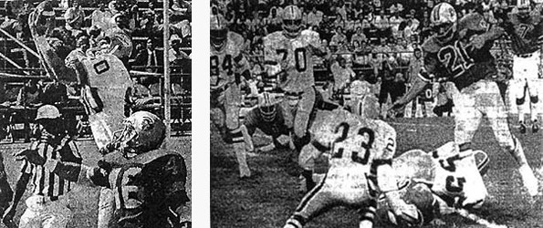 Steamer wide receiver John Odom. Jim Kiick of Memphis runs against the Steamer. Marshall Taylor told reporters from the Shreveport Times after the game, "It was one of the most physical games we've played with both clubs making big plays and taking advantage of breaks... the fans got their money's worth." The Steamer was back on track and the front office was optimistic with the turnout (over 18,000) for the Southern California Sun. During the week the players prepared for the Charlotte Hornets, and the media reported on the troubles with the Portland and Philadelphia franchises. Attendance is both cities were dismal. Portland was attracting about 7,500 a game and Philadelphia was hovering around 4,000. Both teams went unnoticed by the local media and there were several reports that the WFL would (1) fold the franchises or (2) shift or merger the two teams. As the week pressed on, fans and officials waited for the word. In Shreveport, under sunny skies, a crowd of 20,470 fans watched as the Hornets stung Shreveport 39-14 in a shocker. The two teams, Charlotte led 16-7 at halftime, lazily played through a third quarter and then Charlotte exploded in the fourth for 23 points. The Hornets got the lead before halftime when the visitors blocked a Dave Strock punt and returned it to the three, where quarterback Tom Sherman hit Tim George for a touchdown. Sherman completed 17 of 20 passes, and hit George again in the third quarter for a 23-7 lead. Then, as the boos echoed down from the State Fair Stadium stands, Hornet Randy Rhino intercepted a D.C. Nobles pass and returned it 84 yards to put Charlotte up 31-7. After a Steamer score, the Hornets struck again with Jerry Ellison blocking a Dave Strock punt and Dennis Turner returning it for a final 39-14 score. "We probably didn't stay with the basic offense enough," said coach Marshall Taylor after the game, "we didn't do a good job of executing or reading on offense." Taylor added, "Charlotte is a good football team that takes advantage of you....it beats you and you don't even realize you're getting beaten. This is the most disappointing game we've played. I feel sick because we can't start it over. It's sickening the way we played, didn't execute, didn't perform." A dejected Edd Hargett added, "We took the first kickoff and we were doing the things we do well. Then we got away from it and tried to do too much junk. We had some bad plays called. Some were mine, and some were sent in. We didn't make the plays when we needed it." Ricky Scales added, "The last two weeks we capitalized on the other team's mistakes. This week we didn't and they (Charlotte) did." The Steamer seemed to be on track after taking the opening kickoff and marching 70 yards on 17 plays as Jim Nance bulled over for a score with 7:25 left in the quarter- it was all down hill from there. The Steamer fell to 4-6. The following week the Steamer suffered a tough 39-30 loss to Southern California in Anaheim. The game, marred by questionable officiating, left the Steamer lost and searching for answers. The biggest concern was the fact that starting center Sam Holden was thrown out of the game, forcing rookie Rory Best into action. Best, a tight end, played center for the first time and the result was some mishandled snaps that the Sun capitalized on. The Steamer was at its own 10, after Doug Winslow's punt return was nullified due to a clipping penalty, and Edd Hargett dropped back and hit Ricky Scales for a 30 yard completion. The pass was brought back due to another clip and left Shreveport at their own 8. Two plays later, Hargett bobbles a snap and Jim Baker recovers at the 5. Anthony Davis comes in to score a touchdown that puts the Sun up 29-15. Hargett brought the Steamer back completing five in a row and hitting Doug Winslow for a 7-yard score with 9:59 remaining, making it 29-22. Mistakes seemed to haunt the Steamer as Hargett was nailed by Cleveland Vann and fumbled the ball which was recovered by Charles DeJurnett. Seven plays later, Gary Dixon made it 36-22 Sun. One of the bright spots for Shreveport was the running of newly acquired Jimmy Edwards. Edwards, obtained from Birmingham, rushed for 34 yards but scored two touchdowns. Shreveport managed a late score when Edd Hargett nailed Doug Winslow with a 87-yard bomb to cut the lead to 39-30. The game was another high point for Sun running back Anthony Davis who rushed for over 100 yards to reach 1,091 for the season. Marshall Taylor told reporters after the game, "We had to contain Davis to have a chance plus play a mistake-free game. He sits back there eight yards, gets the ball with plenty of vision and can go outside or inside." Shreveport gained only 91 yards rushing- Jim Nance accounting for 67 yards on 11 carries. Jimmy Edwards scored twice on runs of five and 12 yards and gave the Steamer a glimpse of hope, and quarterback Edd Hargett completed 18 of 31 passes for 216 yards and two touchdowns in a losing effort. The Steamer was now 4-7 and tied with Portland for last place in the WFL West. Shreveport came home to play the San Antonio Wings. The Wings, 7-5, had lost three games in a row and were looking to improve on the WFL season. Shreveport had its sights on climbing out of the Western Division cellar. On a beautiful Louisiana day, 8,500 fans sat in the stands and watched the Steamer erupt for a 41-31 win. The Steamer defense had an incredible game intercepting five passes off of former NFL veteran Jerry Tagge, all of them leading to scores. The Steamer opened up a 15-0 lead at halftime off of touchdown runs by Jimmy Edwards and Jim Nance. Edwards ended the game rushing for 82 yards on 20 carries, and Nance added 54 on 17 carries. The Steamer defense gave up only 59 yards on the ground and Tagge was rushed hard most of the afternoon, being sacked twice for a total of 17 yards by defensive end Robert Barber and once by nose guard Willie Parker for minus eight yards. Tagge was playing in place of injured starter 